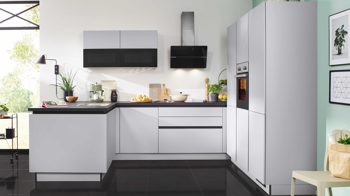 hochgebauter Backofen, vollintegrierter Kühlschrank und eine kopffreie Dunsthaube