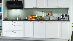 mattweiße Lacklaminatfronten, kombiniert mit schwarzer Steinstruktur-Nachbildung