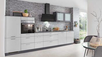 Küchenzeile mit hochwertiger Edelstahl-Einbauspüle und kopffreier Dunsthaube, Länge ca. 270 cm