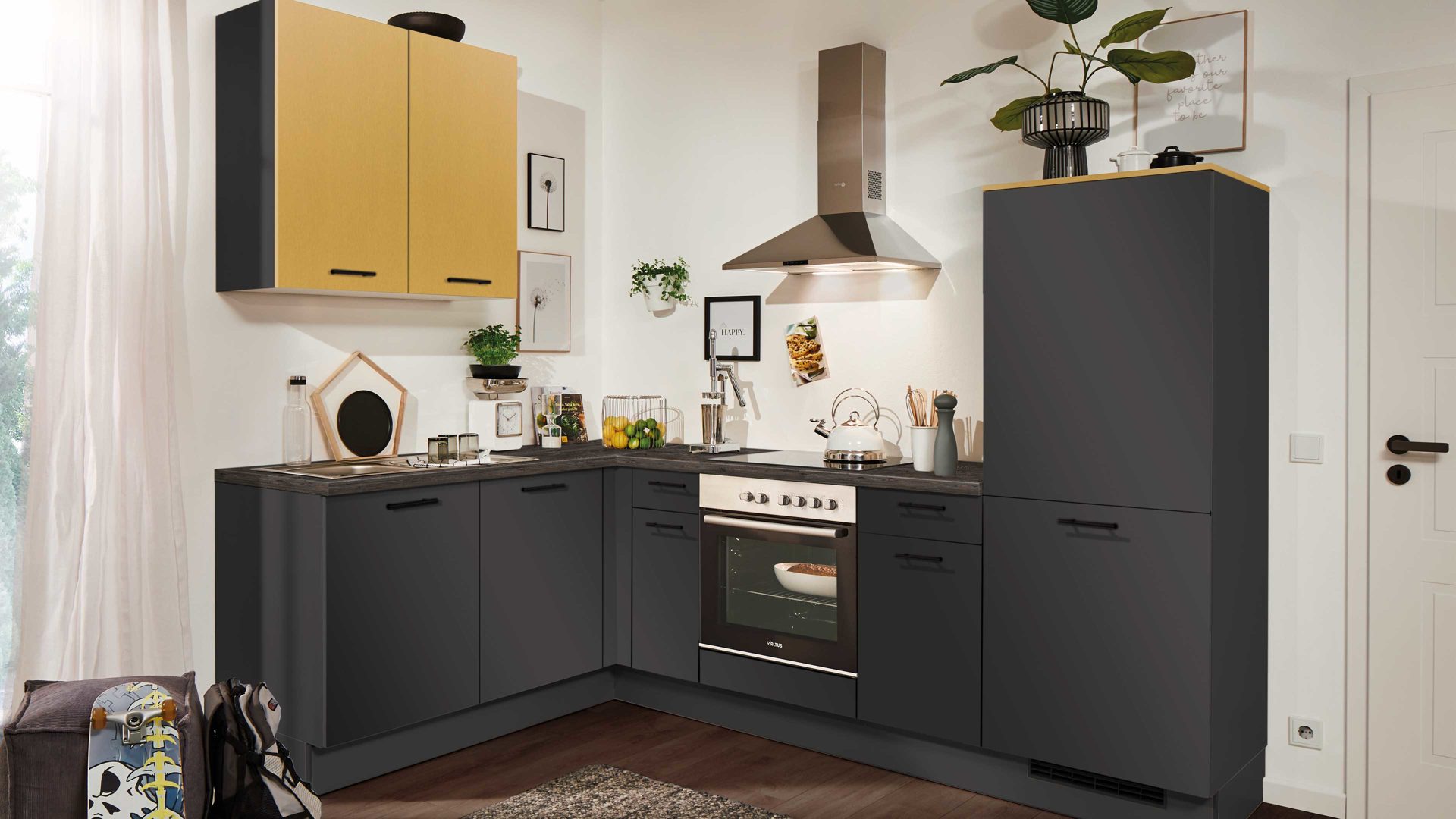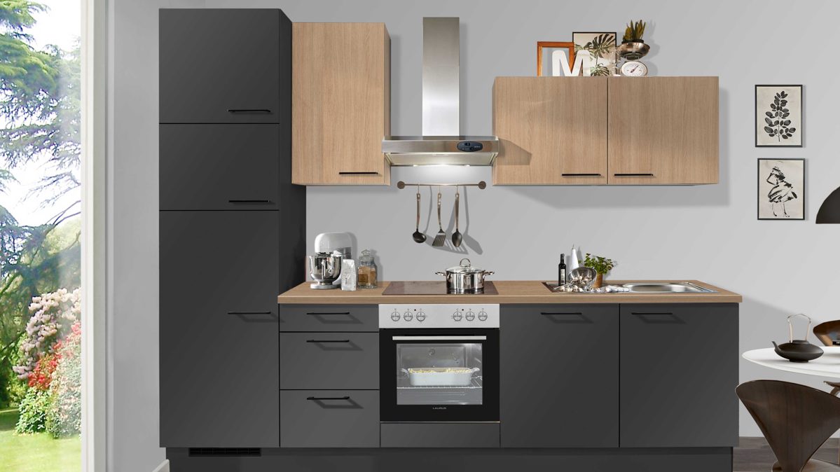 supermattes Grafit und Eiche Aviva-Nachbildung, kombiniert mit schwarzen Metallgriffen und Arbeitsplatte Eiche Aviva-Nachbildung