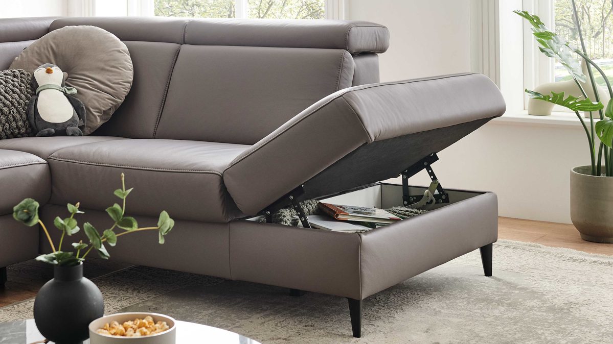 Die Aufklappfunktion ist als Funktions-Mehrpreis erhältlich und erweitert Ihr Sofa um eine durchdachte Stauraum- und Bettkastenfunktion. Besonders praktisch für alle, die zusätzlichen Platz schaffen möchten, ohne auf Design oder Komfort zu verzichten.