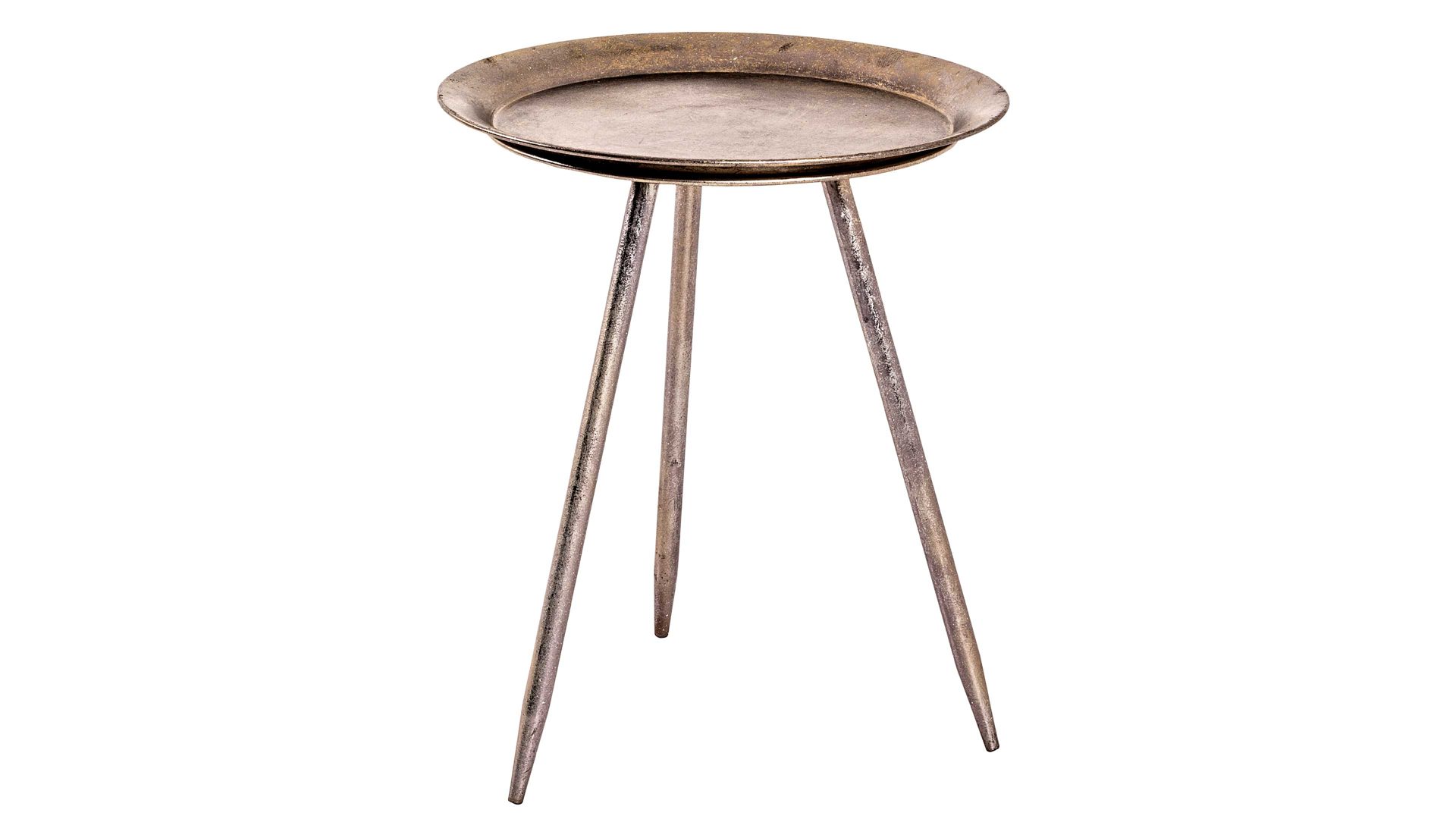 Mit seinem modernen, extravaganten Design wird dieser Beistelltisch zum dekorativen Hingucker im Wohn- oder Schlafzimmer, aber auch im Flur oder Home Office. Dazu überzeugt er qualitativ. Sowohl die Tischplatte als auch das dreibeinige Gestell besteht aus antikbronzefarben lackiertem Metall.