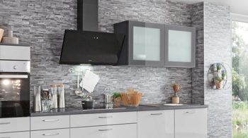Einen attraktiven Akzent setzt die Arbeitsplatte in wiederum anthrazitfarbener Steinstruktur-Nachbildung. Schlichte Edelstahl-Bügelgriffe runden die moderne und elegante Optik der Planküche stilsicher ab.