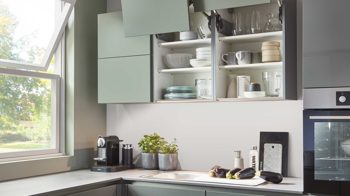 die Hängeschränke mit Lift-Falttüren und die großzügigen Arbeitsflächen. Überdies bieten die Küchenmöbel jede Menge Stauraum.