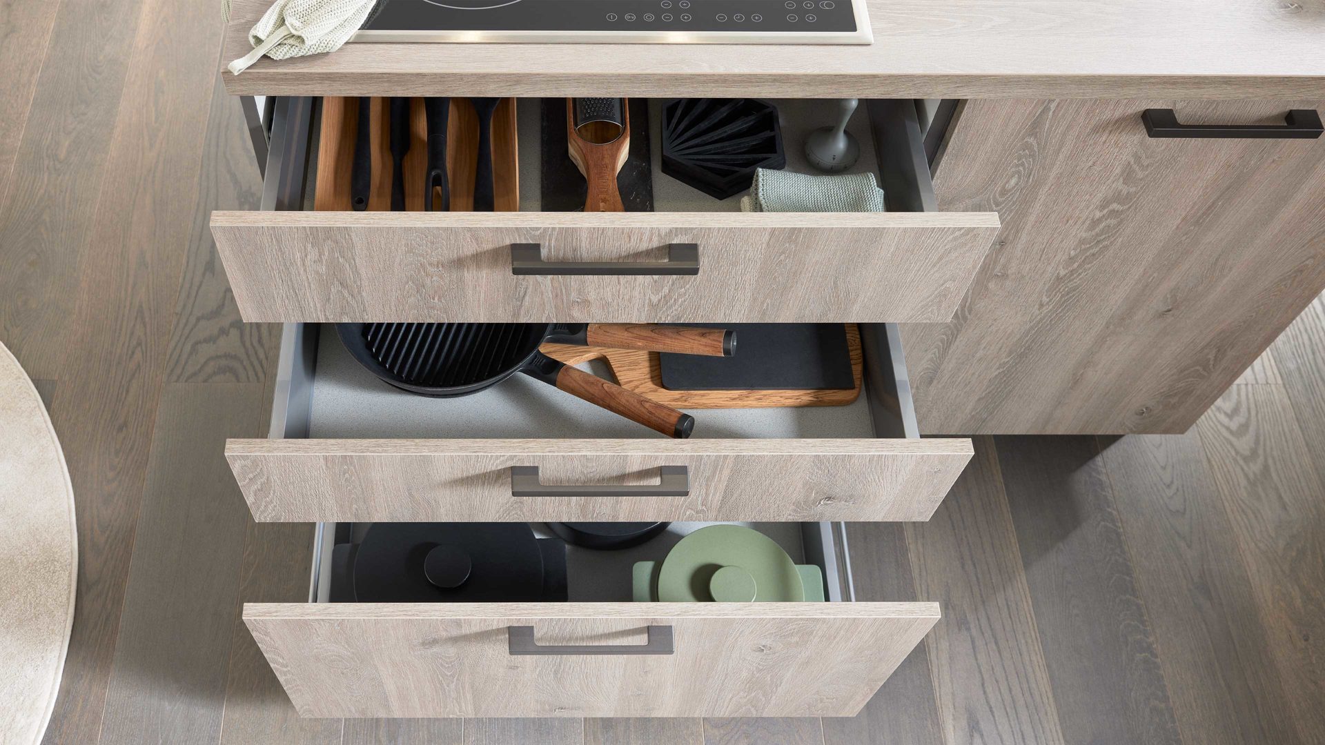 Die hochwertige Edelstahl-Einbauspüle ist im Lieferumfang enthalten und fügt sich harmonisch in das Küchenkonzept ein. Das Zusammenspiel von warmem Eichenholz und kühlem Schiefergrau schafft eine ausgewogene Balance aus Natürlichkeit und Moderne. Durch die Kombination geschlossener Schrankelemente und offener Regalfächer entsteht zudem eine wohnliche, einladende Atmosphäre.