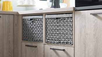 Mit einer Stellfläche von ca. 275 x 305 cm (B/LxT, von links nach rechts) und Schenkelmaßen von ca. 275 x 305 x 275 cm (TxB/LxT, von links nach rechts) bietet die C371 reichlich Platz für Stauraum, Arbeitsflächen und Elektrogeräte. Die extra dicke Pultplatte sorgt für Stabilität und eine elegante Optik, während die extra hohen Hängeschränke zusätzlichen Stauraum schaffen – perfekt für Geschirr, Vorräte und Küchenzubehör. Ein besonderes Highlight sind die integrierten culineo® Flechtkörbe, die Funktion und Dekoration ideal verbinden.