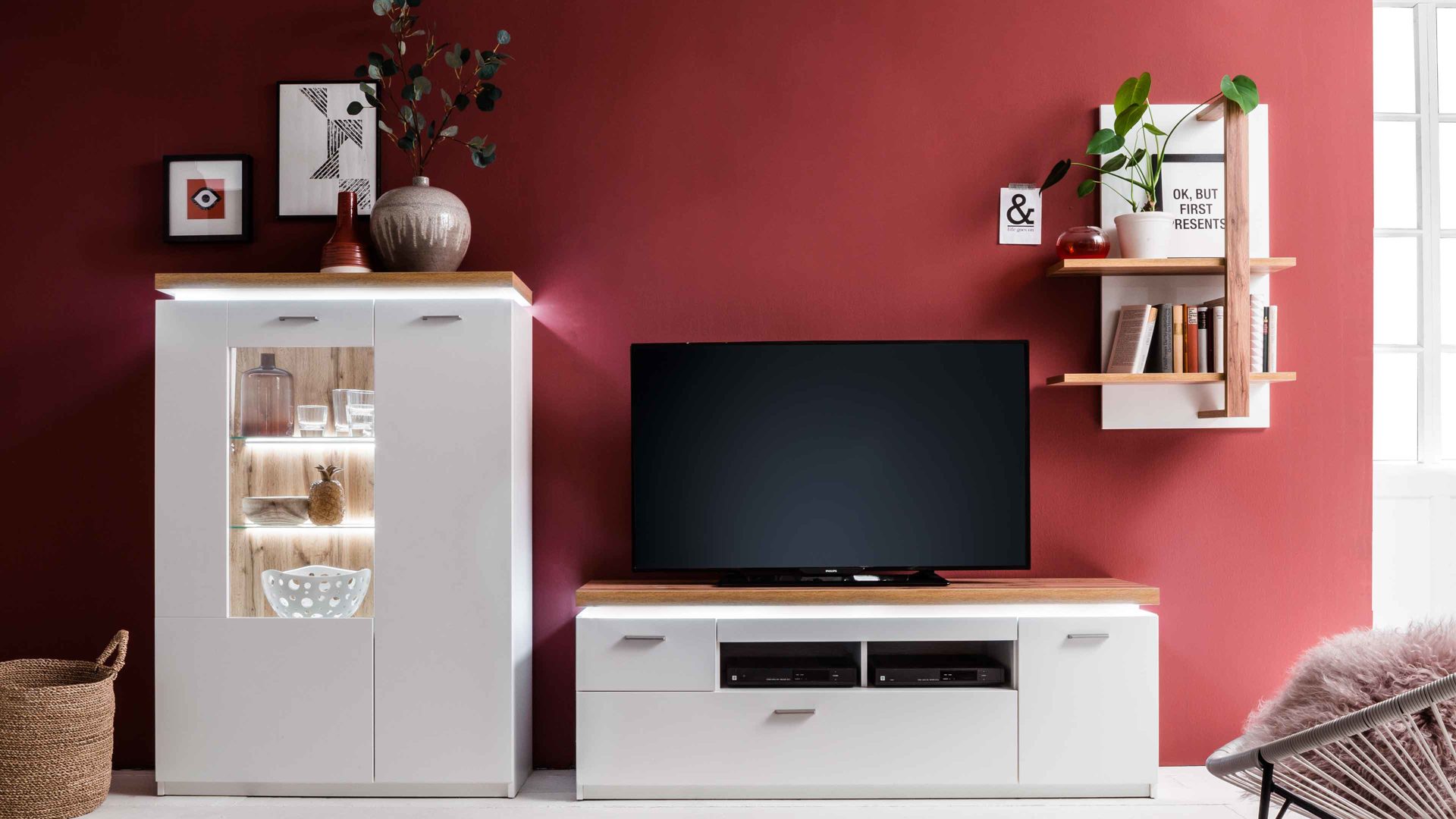 Die dreiteilige Wohnwand 02 aus dem modernen Wohnprogramm Cali setzt sich aus der Highboard-Vitrine T20, dem Lowboard T30 und dem Wandregal T52 zusammen. Sie verbindet kratz- und stoßfeste, weiße Melaminoberflächen mit Wotan Eiche-Nachbildung - und dadurch puristische Eleganz mit natürlich anmutendem Charme. Robuste Metallgriffe und Details aus Klarglas runden die stilvolle Wohnkombination stimmig ab.