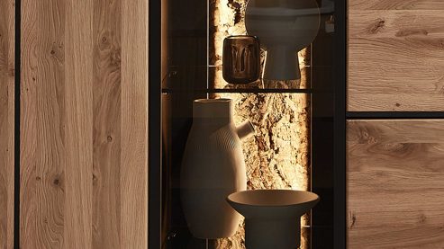 Korpusse außen mit biancofarbenem Wildeiche-Furnier, innnen in biancofarbener Wildeiche-Nachbildung