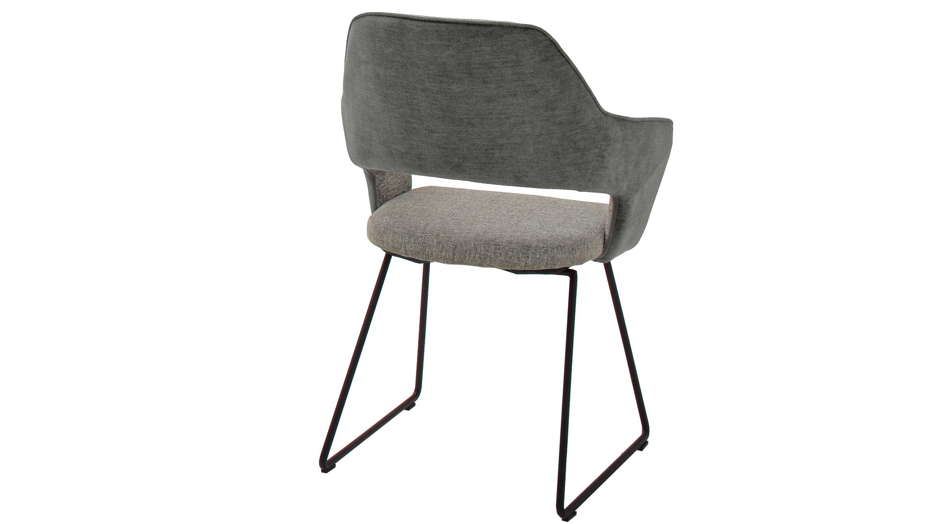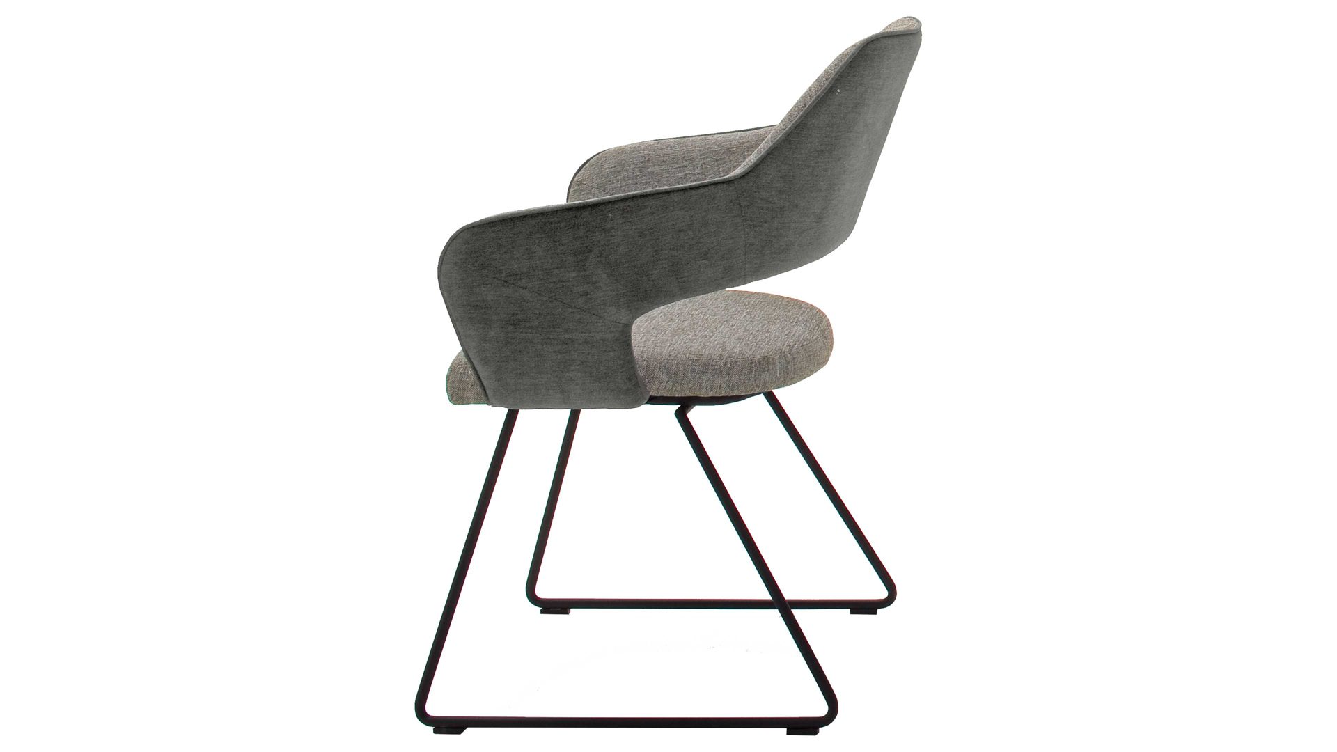 Als Basis fungiert ein anthrazitfarben lackiertes Kufengestell. Es gewährleistet die nötige Robustheit und Stabilität. Die Außenflächen sind mit melangefarbenem Feingewebe, die Innenflächen mit Flachgewebe im Farbton Melange bezogen. Durch die klassisch-elegante Farb- und Materialgestaltung lässt sich der Stuhl wunderbar mit den verschiedensten Einrichtungsstilen kombinieren.