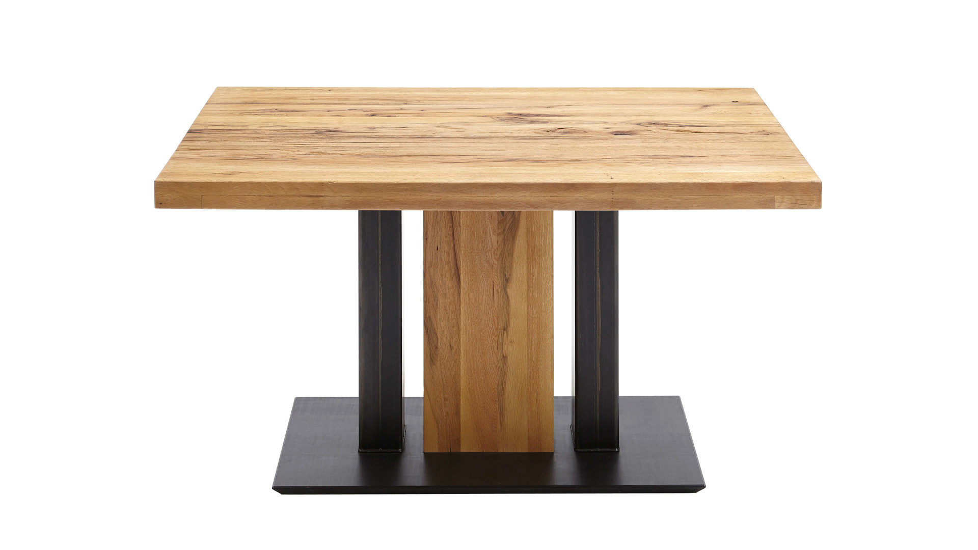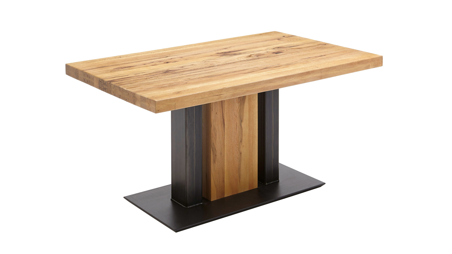 Als stabilisierende Basis fungiert eine elegant-schwarze MDF-Bodenplatte. Auch die dekorativen und robusten Roheisen-Säulen, die im Gestell verbaut sind, präsentieren sich in klassischem Schwarz. Durch die gerissene Balkeneiche mit dem naturfarbenen Wachslackeffekt, die das Gestell wie die Tischplatte ziert, bringt der Tisch eine wunderbar warme, einladende Ausstrahlung in den Raum.