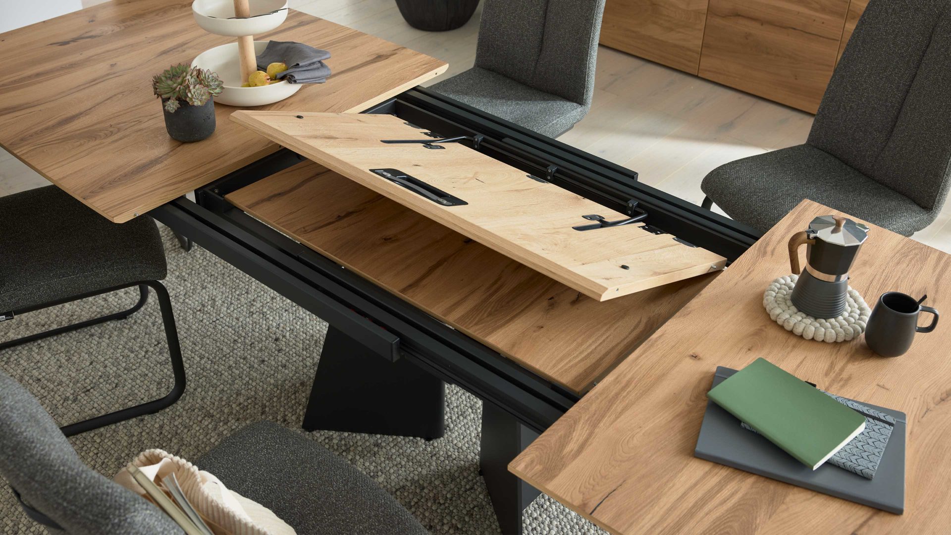 Die Verlängerung funktioniert dank des integrierten Mittelauszugsystems besonders komfortabel. Mit wenigen Handgriffen ziehst du die Tischplatte auseinander und klappst die innenliegende Einlage einfach auf. So vergrößerst du die Tischfläche um ca. 100 cm – schnell, leicht und stabil.