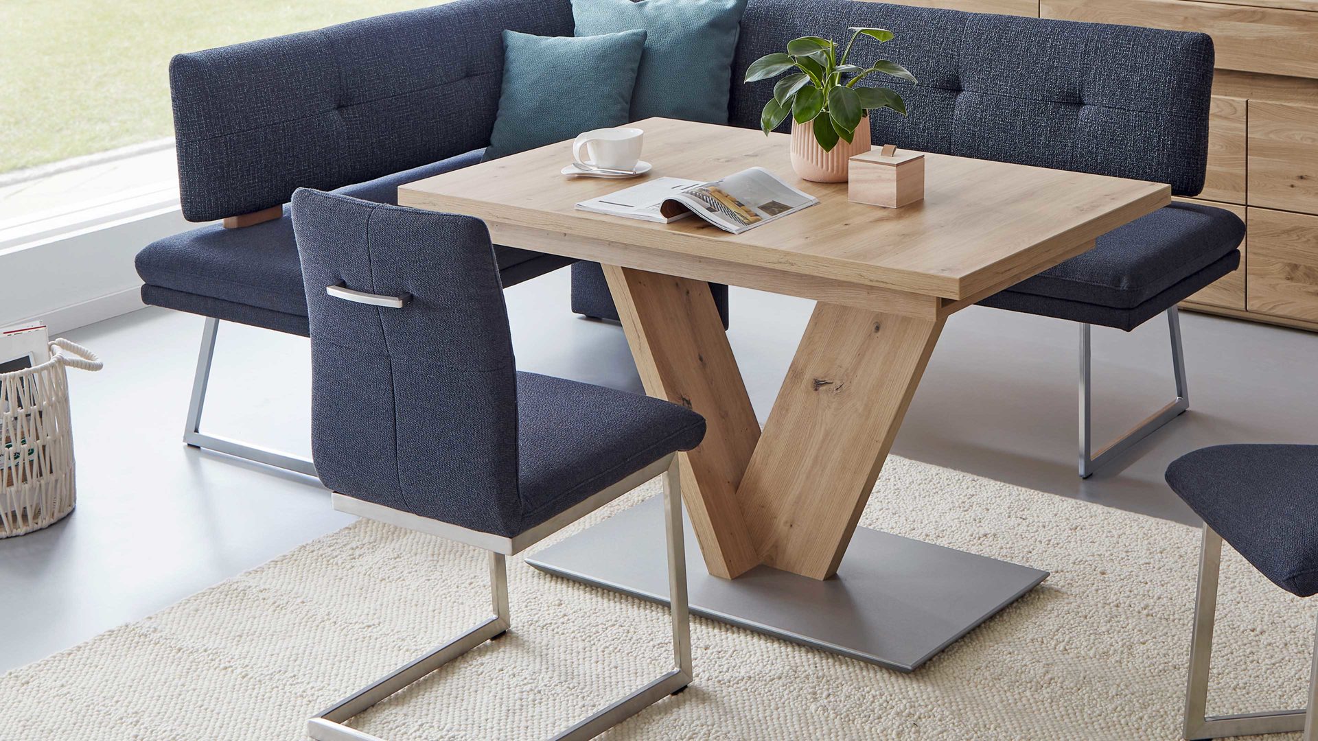 • Die Abbildung zeigt ein Wohnbeispiel, welches auch Dekoration sowie separat erhältliches Zubehör enthält. Im Lieferumfang enthalten ist der Massivholz-Esstisch Gino.