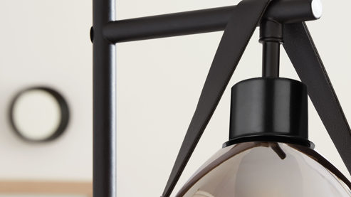 Die Tischleuchte aus der Interliving Leuchten Serie 9332 verbindet klassisch mattschwarzes Metall mit einem stilvollen Lampenschirm aus verspiegeltem, rauchfarbenem Glas und schwarzem Kunstleder. Diese edle Materialkombination verleiht der Lampe eine moderne, leicht futuristische Ausstrahlung mit einem Hauch von Industrial-Stil – perfekt, um deinem Wohn- oder Arbeitsbereich ein stilvolles Highlight zu verleihen.