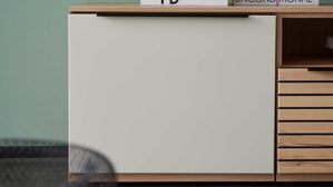 Das Lowboard setzt auf klare Strukturen und Funktionalität: Das linke Element ist eintürig und mit einem höhenverstellbaren Holzboden ausgestattet. In der Mitte befindet sich ein Stauraumelement mit einem offenen Fach mit praktischem Kabeldurchlass sowie einer Schublade mit Softauszug – ideal für Receiver, Spielekonsolen oder Fernbedienungen. Das rechte Element entspricht dem linken und sorgt für zusätzliche Stauraummöglichkeiten.