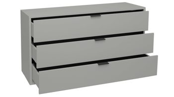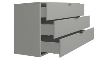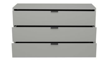 Die stabile Kommode ist mit drei Schubladen ausgestattet, die Ihnen beispielsweise Stauraum für Wäsche bieten und durch die Softclose-Funktion sanft und leise schließen. Auf dem Oberboden haben Sie Platz für eine Lampe und auch andere Deko. Die Maße des Kommodenschranks betragen ca. 119 x 67 x 45 cm (BxHxT).