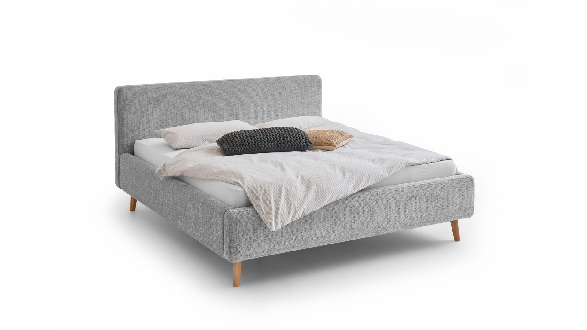 Das Polsterbettgestell Mattis begeistert durch die elegante Optik sowie die hervorragende Material- und Verarbeitungsqualität. Es kombiniert einen grauen Chenille-Bezug mit eichefarbenen Holzfüßen. Sowohl die Bettseiten als auch das Polsterkopfteil sind glatt bezogen. Letzteres lädt Sie ein, sich anzulehnen, wenn Sie abends im Bett vor dem Schlafen noch fernsehen oder in einem Buch lesen.