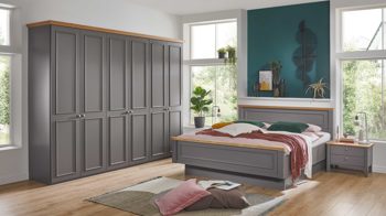 Die Kombination besteht aus einem 6-türigen Kleiderschrank, der durch eine Bauchbinde aus Riffholz und Leisten in Anthrazit besonders hervorsticht. Der Kleiderschrank bietet ausreichend Stauraum für Ihre Kleidung und Accessoires. Das Doppelbettgestell mit einer Liegefläche von ca. 180 x 200 cm verfügt über ein anthrazitfarbenes Polsterkopf- und Fußteil mit Winkelfuß und Leiste. Dies sorgt nicht nur für einen angenehmen Schlafkomfort, sondern auch für eine moderne Optik. Zusätzlich sind zwei Hängenachtkommoden im Lieferumfang enthalten.