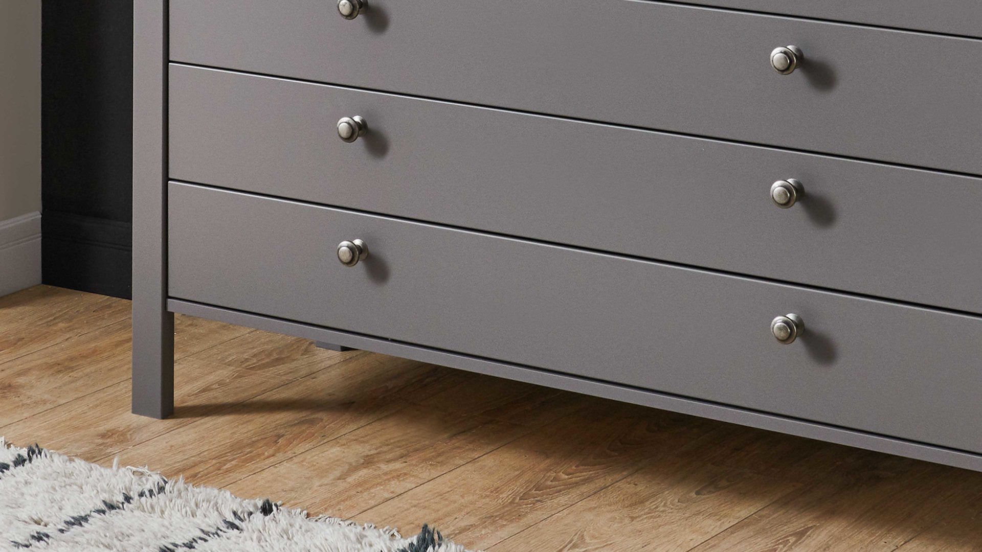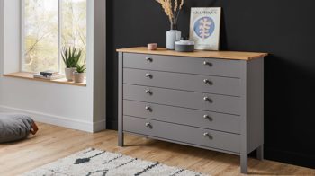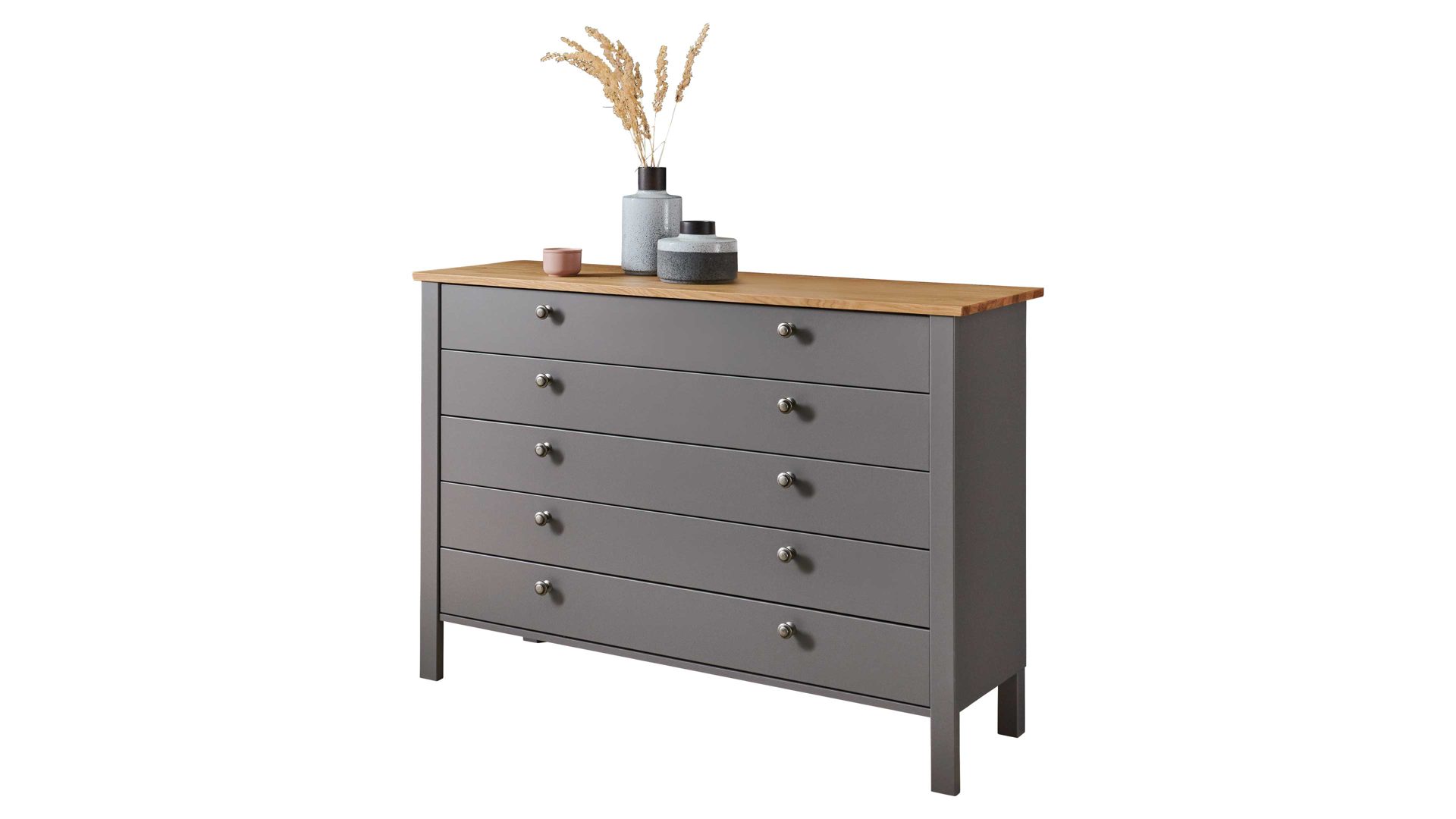 Die mattnickelfarbigen Knopfgriffe Nr. 90985 ergänzen das Design des Kommodenschranks perfekt und sorgen für eine harmonische Gesamtoptik. Mit den fünf Schubladen, die über Teilauszug und Softclose-Funktion verfügen, haben Sie genügend Stauraum für Ihre Kleidung und Accessoires. Der Selbsteinzug ermöglicht ein bequemes Öffnen und Schließen der Schubladen.