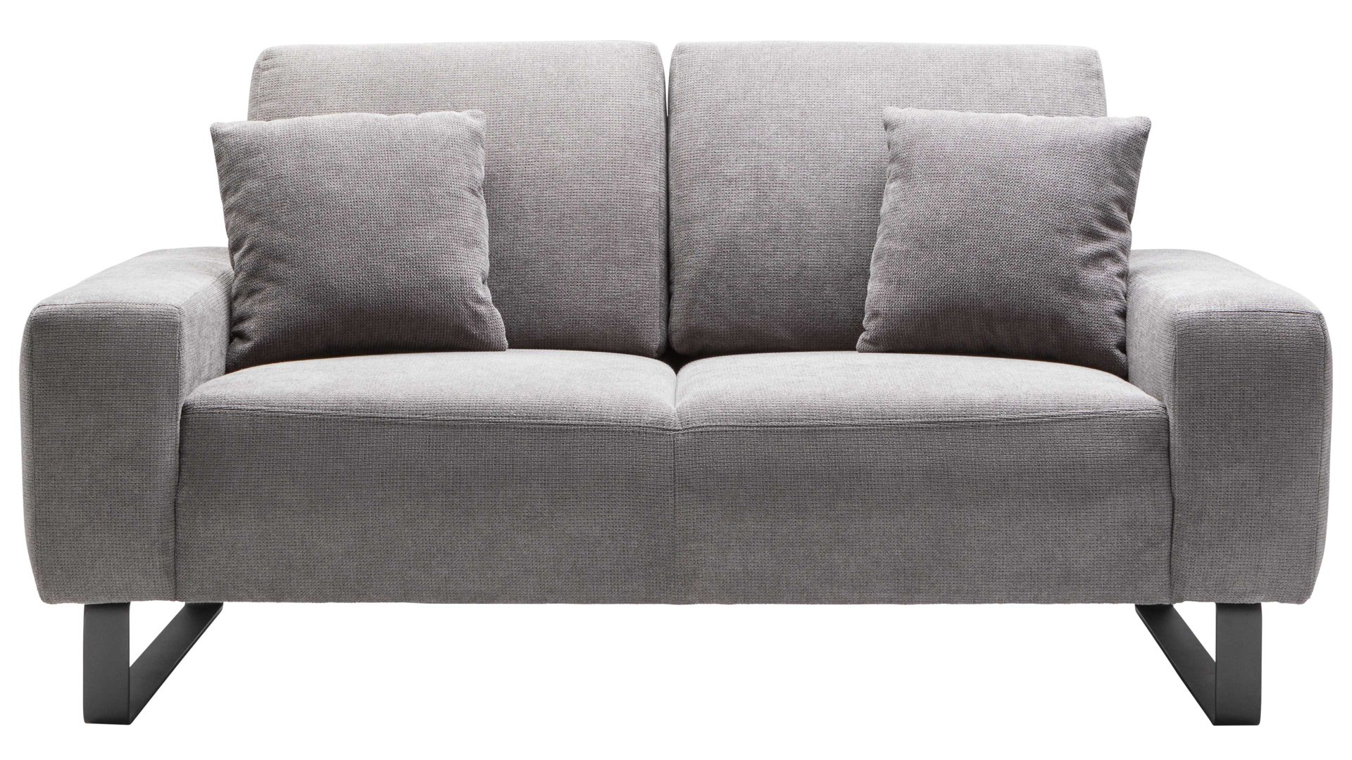 Der moderne 2-Sitzer Dana kombiniert einen stilvollen steinfarbenen Stoffbezug mit mattschwarz lackierten Metallkufen und strahlt schlichte Eleganz aus. Dadurch fügt er sich in unterschiedliche Wohnstile stimmig ein.