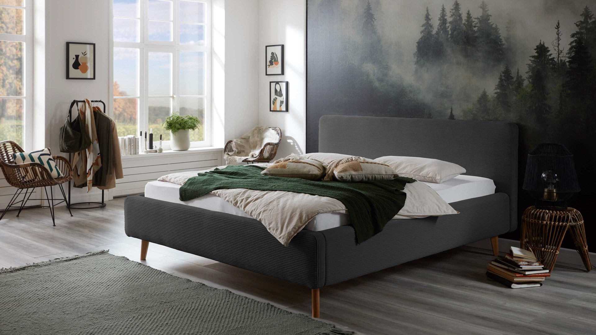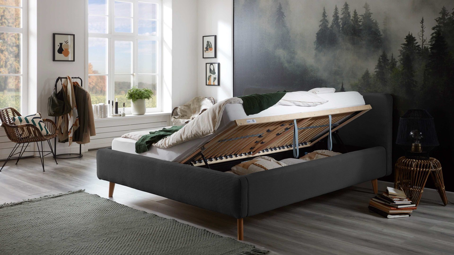 Das Polsterbettgestell Mattis mit Bettkasten begeistert durch die elegante Trendoptik sowie die exzellente Material- und Verarbeitungsqualität. Es kombiniert eichefarbene Holzfüße mit einem anthrazitfarbenen Breitcordbezug. Sowohl die Bettseiten als auch das Polsterkopfteil sind glatt bezogen. Letzteres lädt Sie ein, sich anzulehnen, wenn Sie abends im Bett vor dem Schlafen noch fernsehen oder in einem Buch lesen.