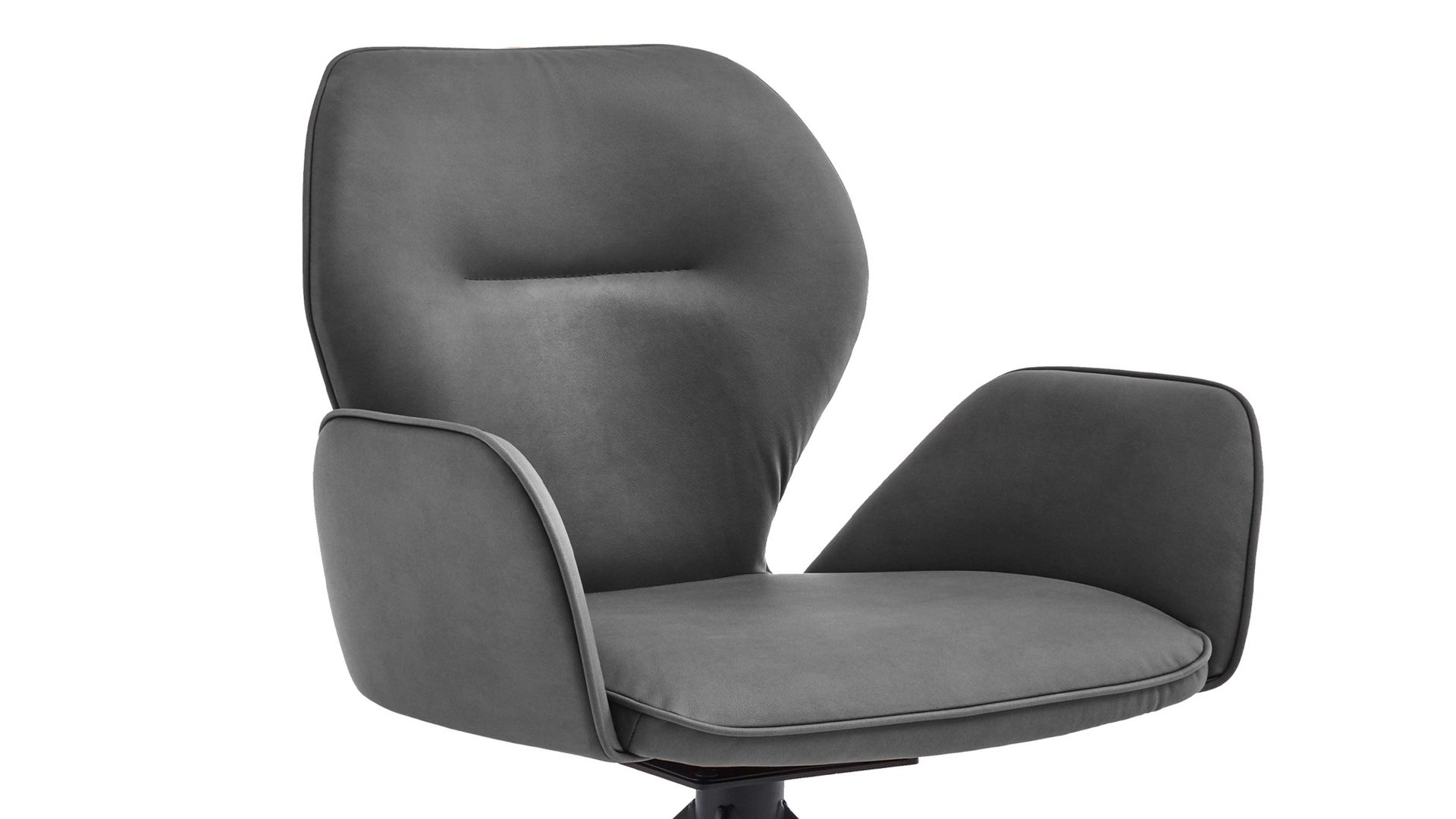 Er kombiniert ein mattschwarz lackiertes Stativgestell aus robustem Eisen mit einem silberfarbenen Mikrofaserbezug in Lederoptik und fügt sich in verschiedene Wohnstile harmonisch ein. Zu den optischen Highlights des Esszimmerstuhls gehört neben der Formensprache und den perfekt aufeinander abgestimmten Farben der markante Quereinzug im Rücken. Praktisch begeistern die Drehbarkeit um 180 Grad mit Rückholfunktion sowie die bodenschonenden Gleiter am Gestell.