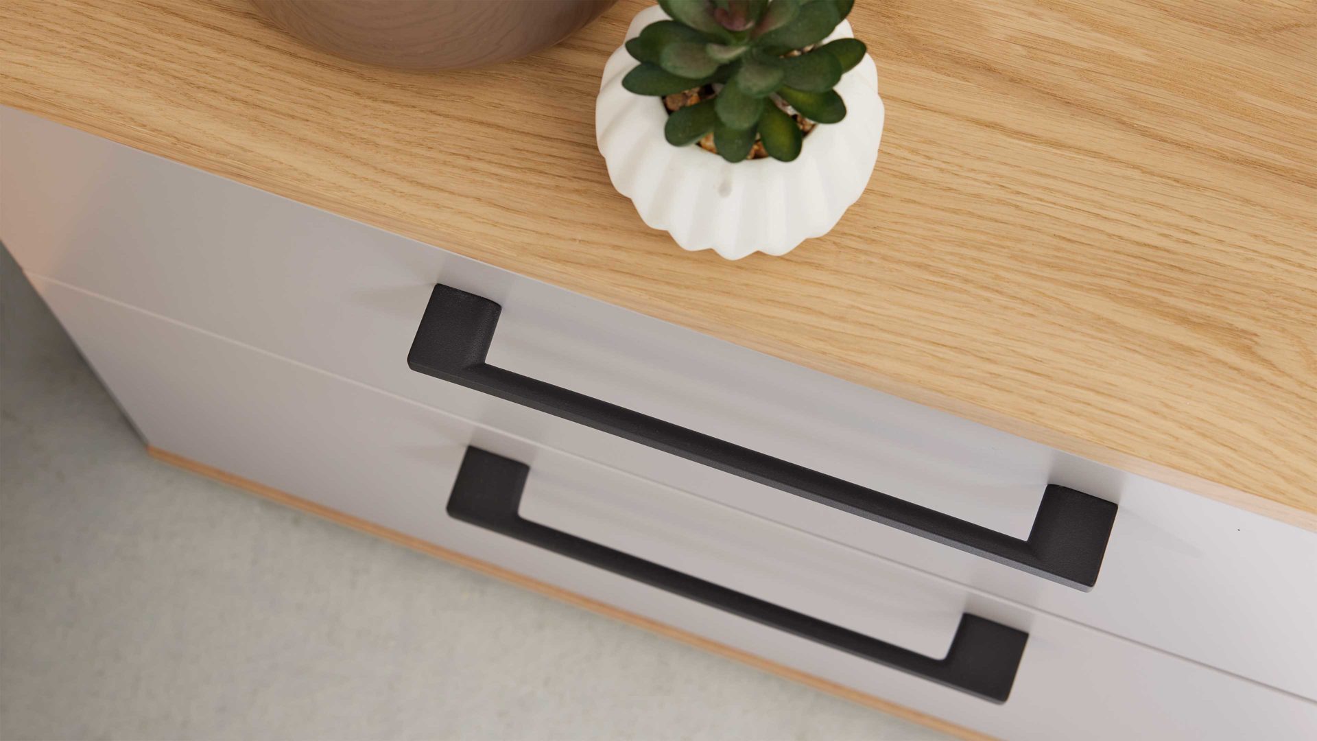 Die zwei Schubladen überzeugen mit Vollauszug, Selbsteinzug und Softclose-Funktion – für ein angenehm leises und komfortables Öffnen und Schließen. Das macht die Kommode nicht nur optisch, sondern auch funktional zu einem echten Highlight im Schlafzimmer.