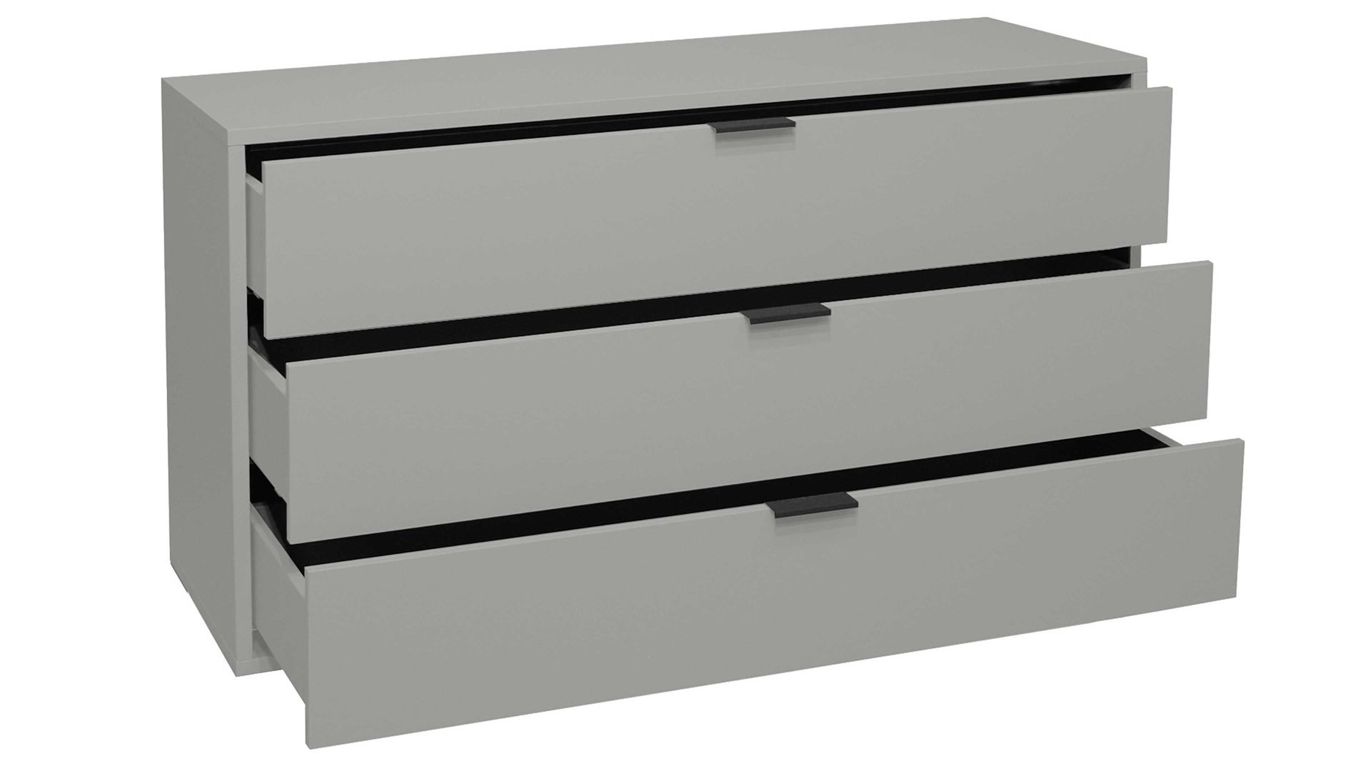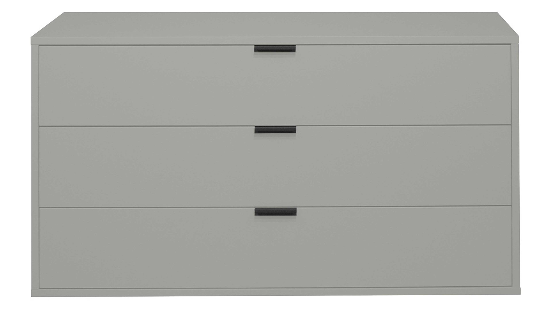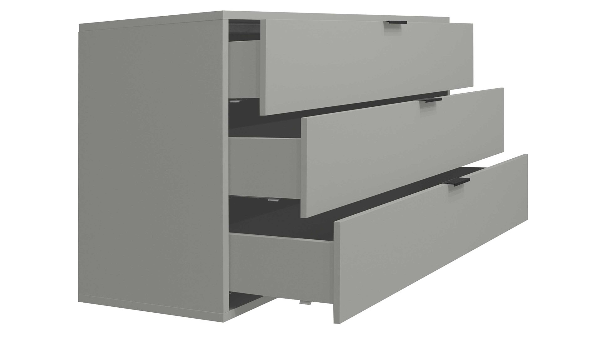 Mit ihren kreidegrauen Mattlackoberflächen verkörpert die Schubladenkommode Bonnie moderne Eleganz. Schwarze Metallgriffe und praktisch höhenverstellbare Möbelgleiter runden das stilvolle Design harmonisch ab. Zu den qualitativen Höhepunkten gehören überdies die widerstandsfähigen abgerundeten Dickkanten.