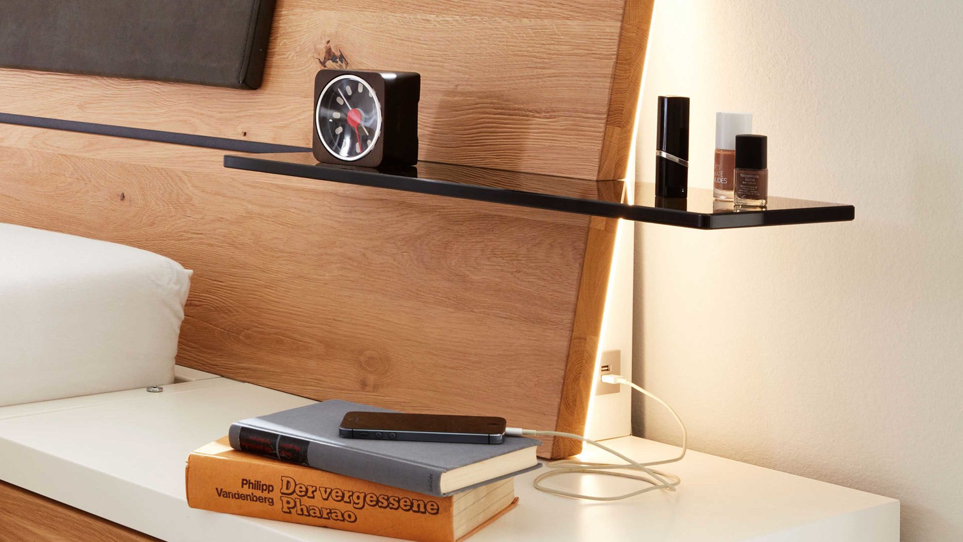 Stylisch, modern und perfekt integriert: Das Glasboden-Setaus der Interliving Schlafzimmer Serie 1019 ist ein elegantes Mehrpreis-Zubehör für die Bettkopfteile der Komfort-Doppelbetten. Damit ergänzt du dein Bett um praktische Ablageflächen, die optisch leicht wirken und gleichzeitig hochwertig verarbeitet sind.