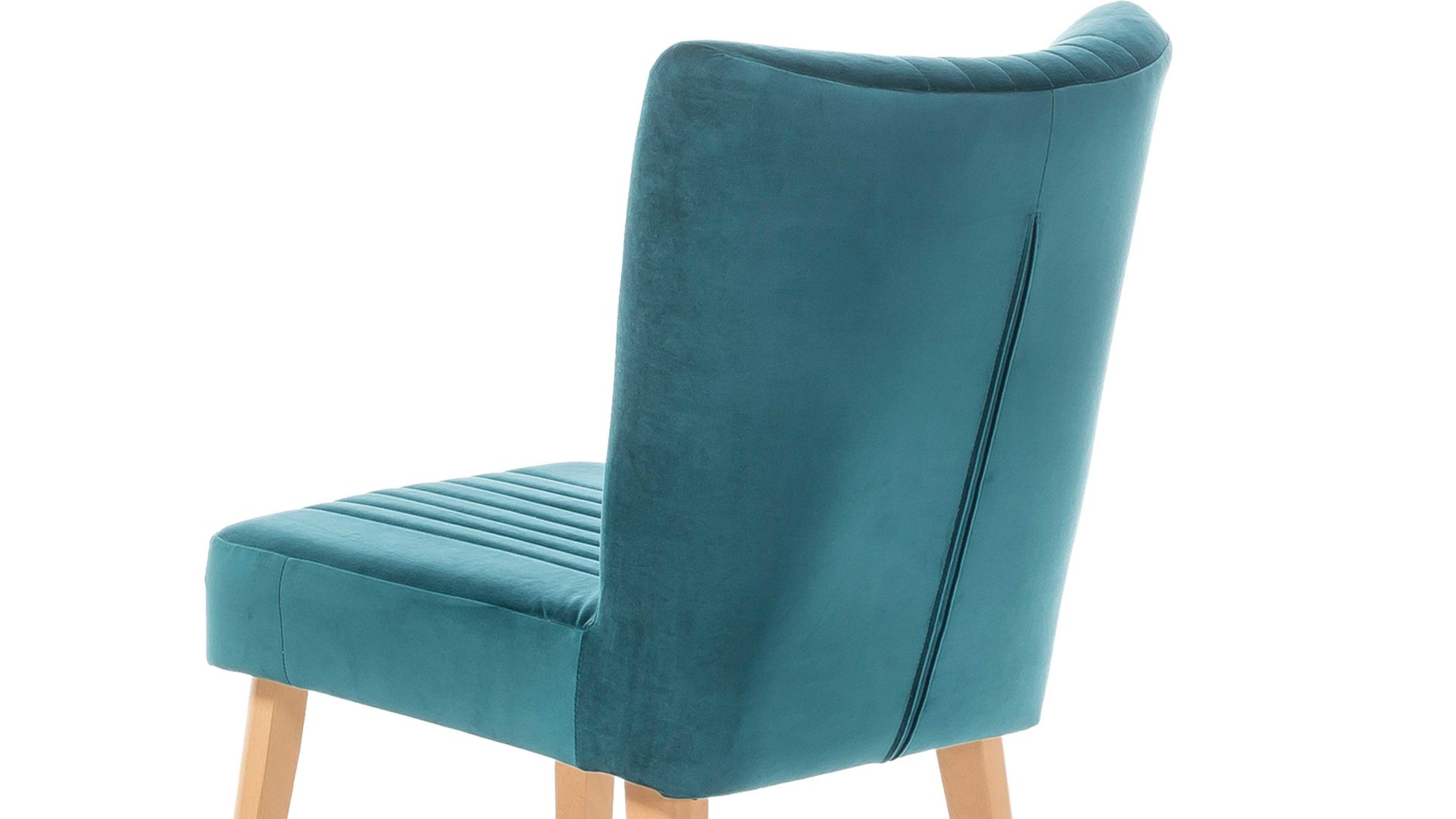 Ein farblicher Hingucker ist der hochwertige Polsterstuhl mit petrolfarbenem Bezug im modernen Samtlook. Aufwendige Steppnähte, die auf Sitz und Rücken angebracht sind, geben dem Sitzmöbel zusätzlich eine interessante Optik. Am besten passt der Polsterstuhl mit den Maßen von ca. 46 x 92 x 66 cm (BxHxT) an einen Esstisch aus Eiche, da auch das Holzgestell aus Eiche natur ist.