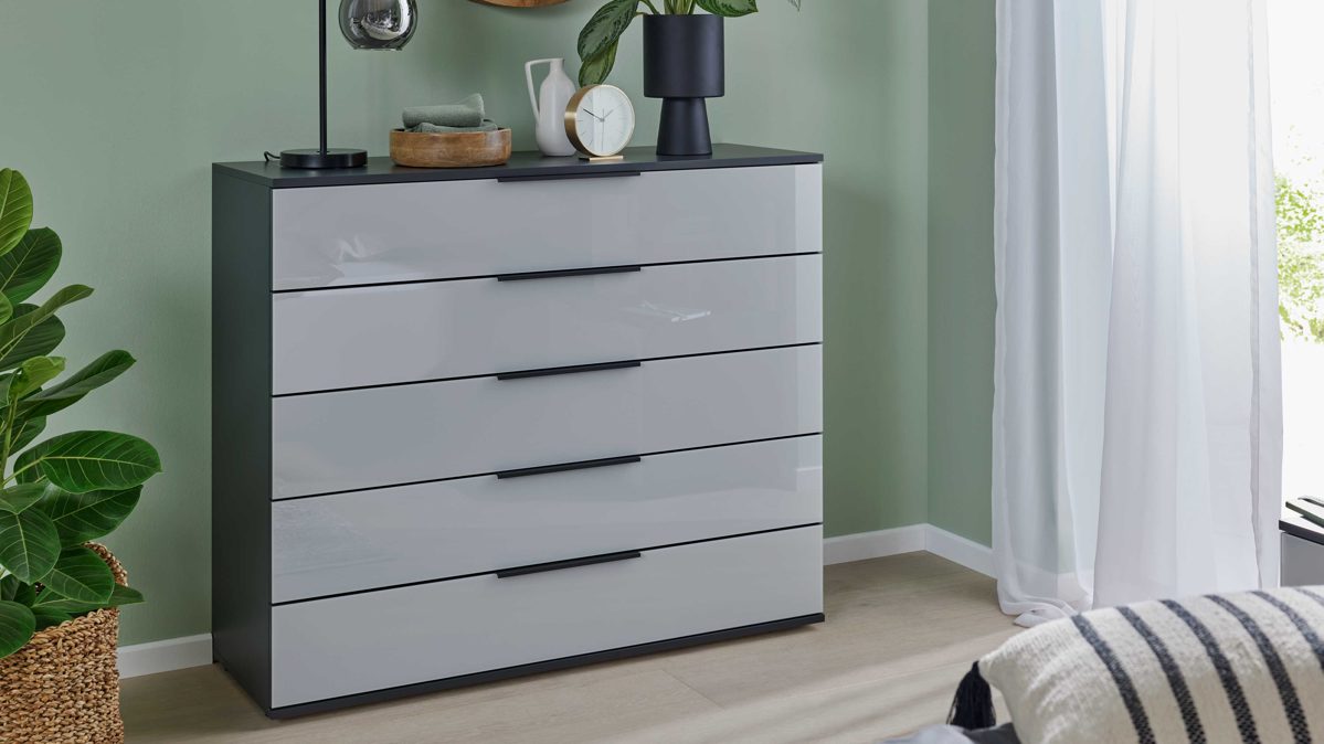 Die Schubladenkommode überzeugt als elegantes Solitärmöbel mit zeitloser Ausstrahlung. Mit seidengrauen Fronten-Glasauflagen, einem basaltfarben lackierten Korpus und anthrazitfarbenen Metallgriffen Basic fügt sie sich harmonisch in moderne Schlafzimmer ein. Ob als Wäschekommode, Schubladenschrank oder dekoratives Wohnmöbel – sie vereint Design und Funktion perfekt.