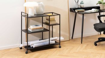 Dieser Servierwagen ist im modern interpretierten Industriestil designt. Damit verströmt er spezielles Flair und zieht die Blicke auf sich. Der außergewöhnlich gestaltete Küchenwagen besteht aus mattschwarz pulverbeschichtetem Metall mit rauer Oberfläche. Durch das erstklassige Material und die hochwertige Verarbeitung ist er enorm robust und langlebig.