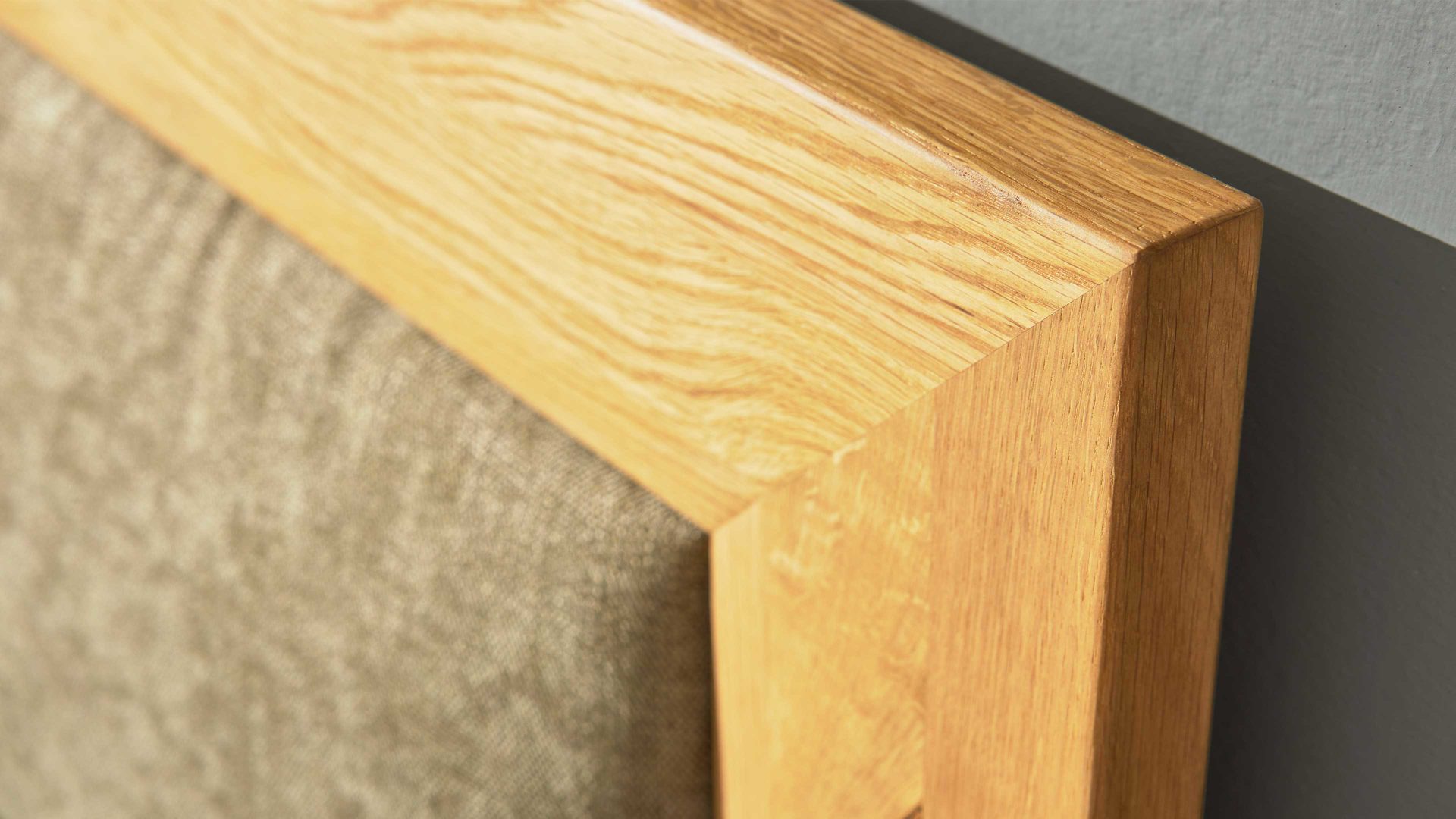 Ein besonderer Blickfang ist das ca. 120 cm hohe, gepolsterte Kopfteil mit seiner edlen Holzumrandung. Gemeinsam mit dem Schwebefuß entsteht eine luftige, elegante Optik, die Leichtigkeit und Modernität ausstrahlt.