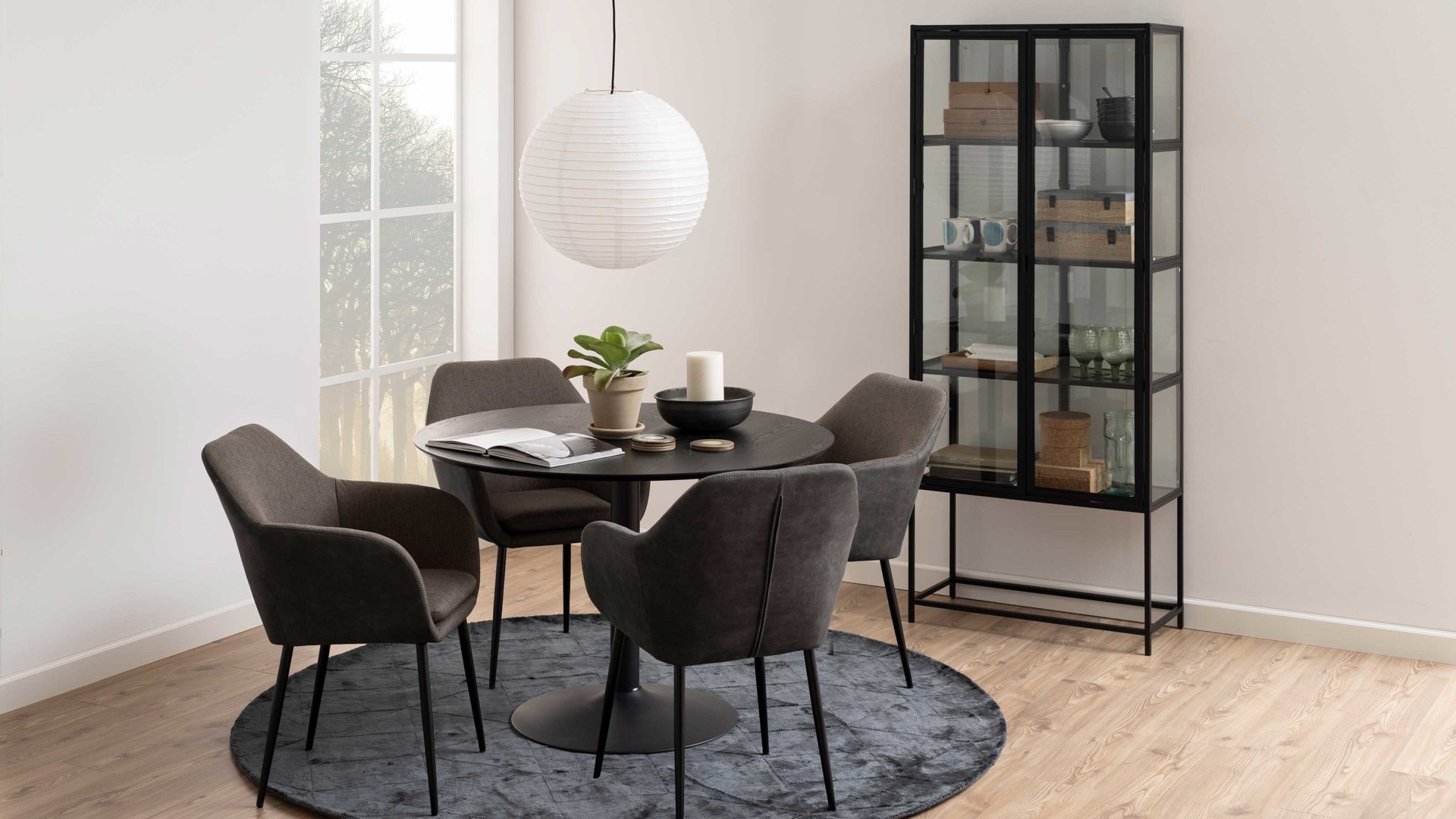 Sein Gestell besteht aus mattschwarz pulverbeschichtetem Metall mit rauer Oberfläche. Hinzu kommen gehärtetes Glas und klassisch-schwarze Esche-Nachbildung, die durch die erstklassige Melaminbeschichtung besonders kratz- und stoßfest sowie wasserabweisend ist, was sie besonders robust und pflegeleicht macht.