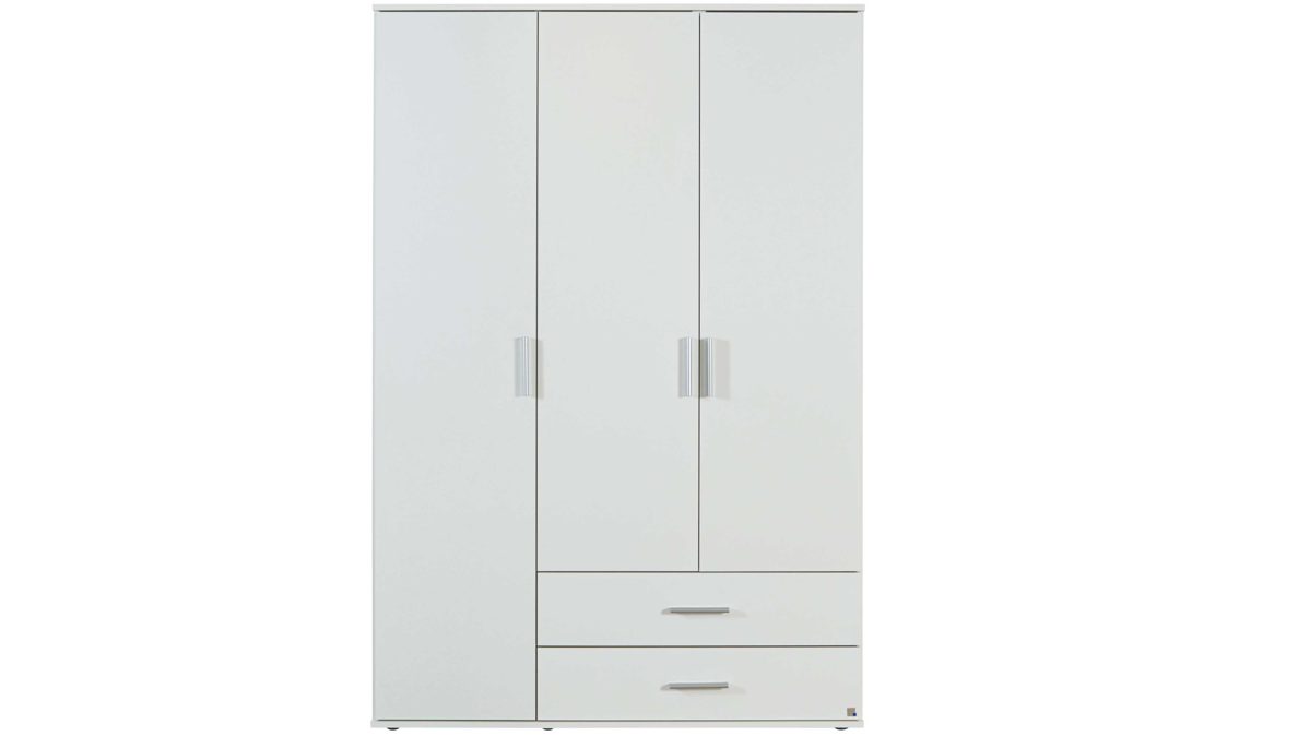 Drei Türen und zwei Schubladen machen das Aufräumen und Ordnen im Schlafzimmer oder Ankleidezimmer zum unkomplizierten Kinderspiel. Auf vier Böden und an einer Kleiderstange bringen Sie Ihre Kleidung sowie Accessoires und Bettwäsche platzsparend unter. Auch als Aufbewahrungslösung im Flur oder im Gästezimmer eignet sich der Schrank hervorragend, der sich farblich zurücknimmt und ein aufgeräumtes Gesamtbild schafft.