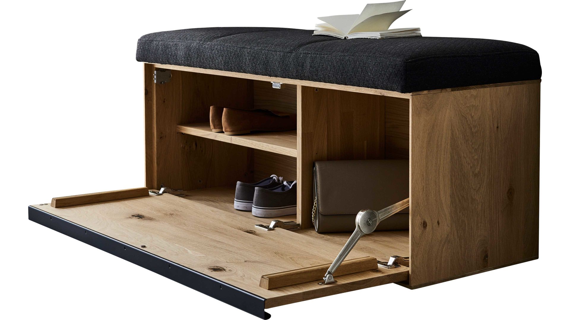 Die Garderobenbank Runa verbindet massive Kerneiche sowie anthrazitfarbenes Metall und einen ebenfalls anthrazitfarben gestalteten Stoff zu einem robusten, modernen und eindrucksvollen Ganzen.