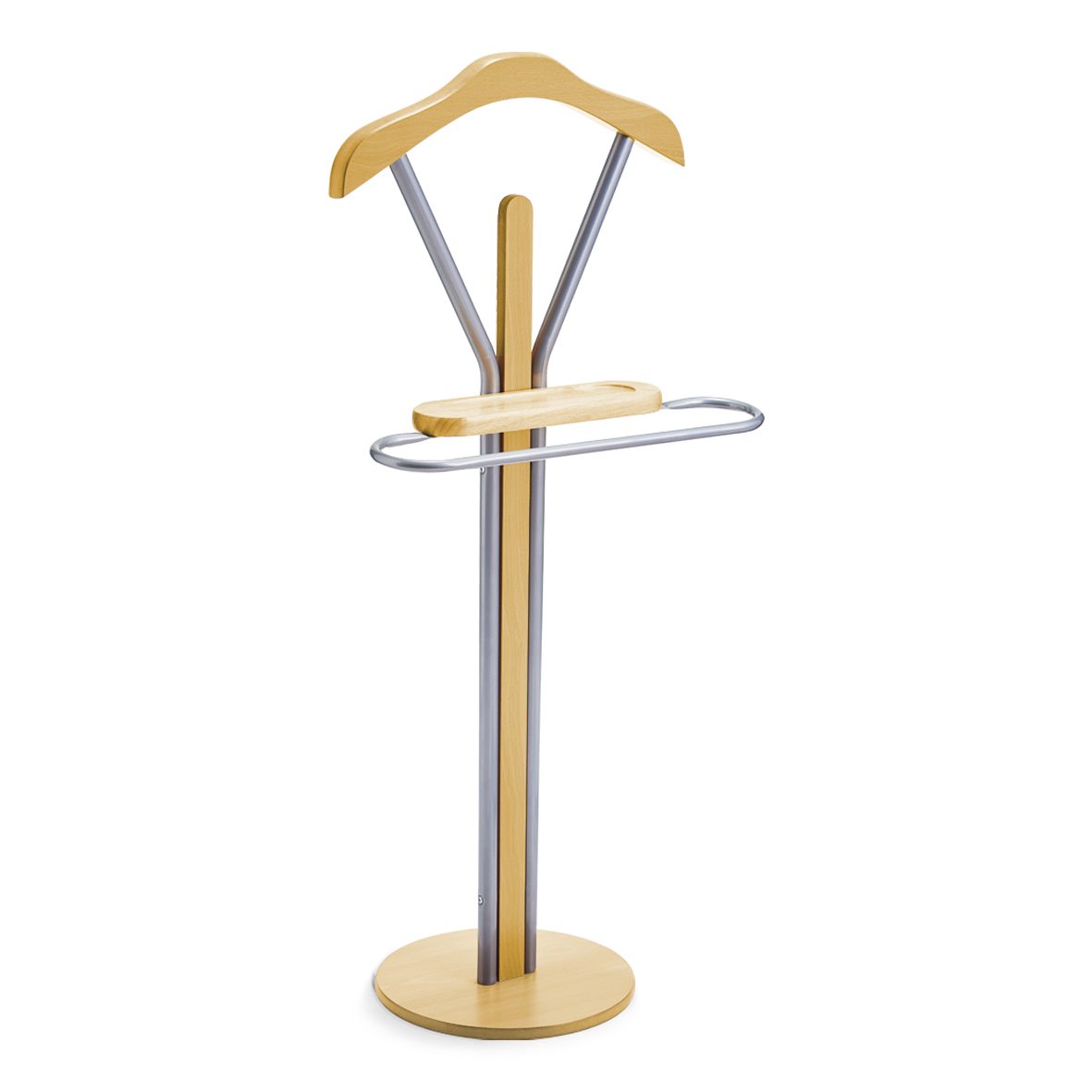 Dieser Herrendiener kombiniert buchefarbenes MDF mit trendigem aluminiumfarbenem Metall.