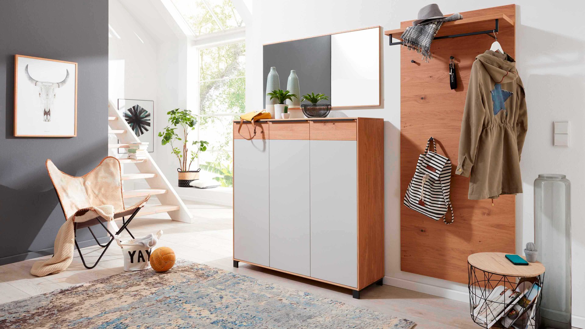 Miss deinen Eingangsbereich sorgfältig aus und plane ausreichend Bewegungsfläche ein – besonders vor Schrank und Kommode. Durch die kompakten Tiefen von jeweils ca. 38 cm (B/LxHxT bei den Hauptmöbeln) eignet sich dieses Garderoben-Set ideal auch für schmalere Flure. Kombiniere helle Wandfarben mit natürlichen Accessoires, um die warme Ausstrahlung der Eiche natur Nachbildung zu unterstreichen und deinem Zuhause schon im Eingangsbereich eine einladende Atmosphäre zu verleihen.