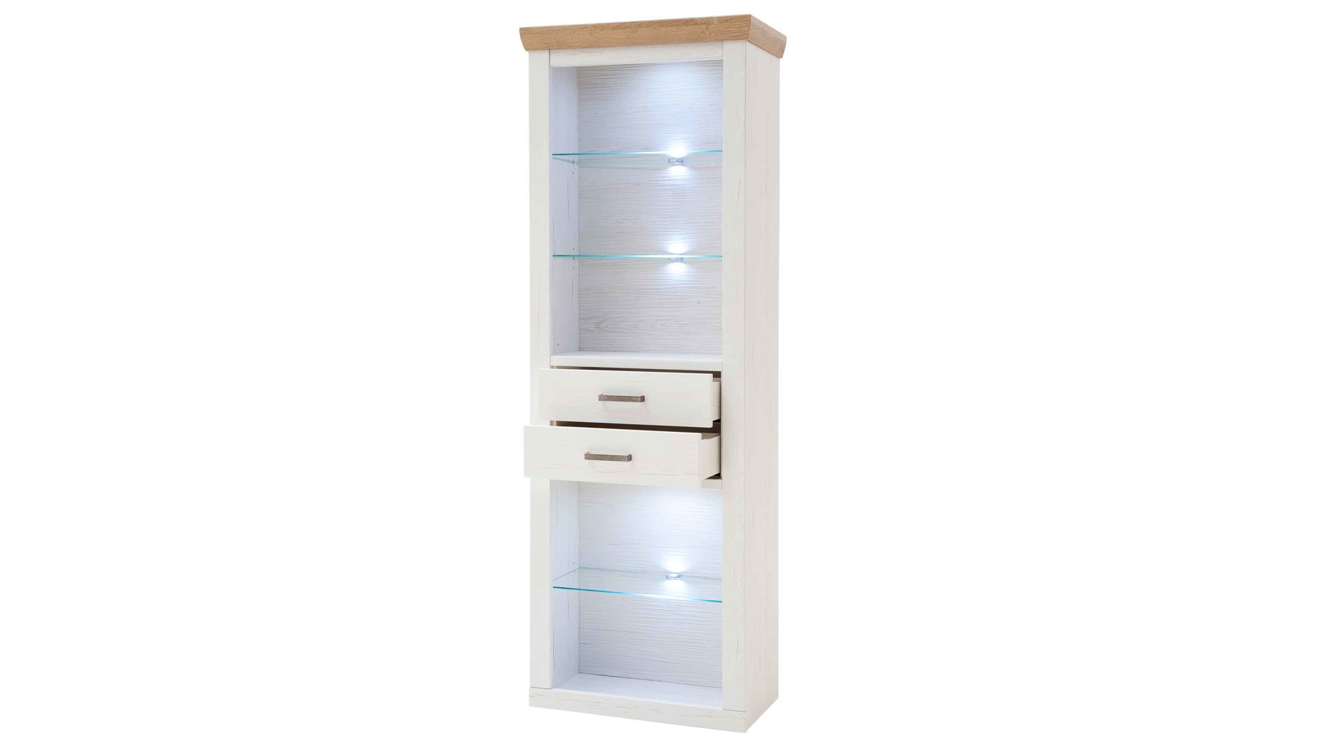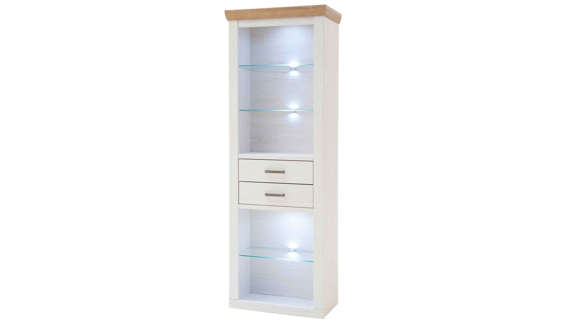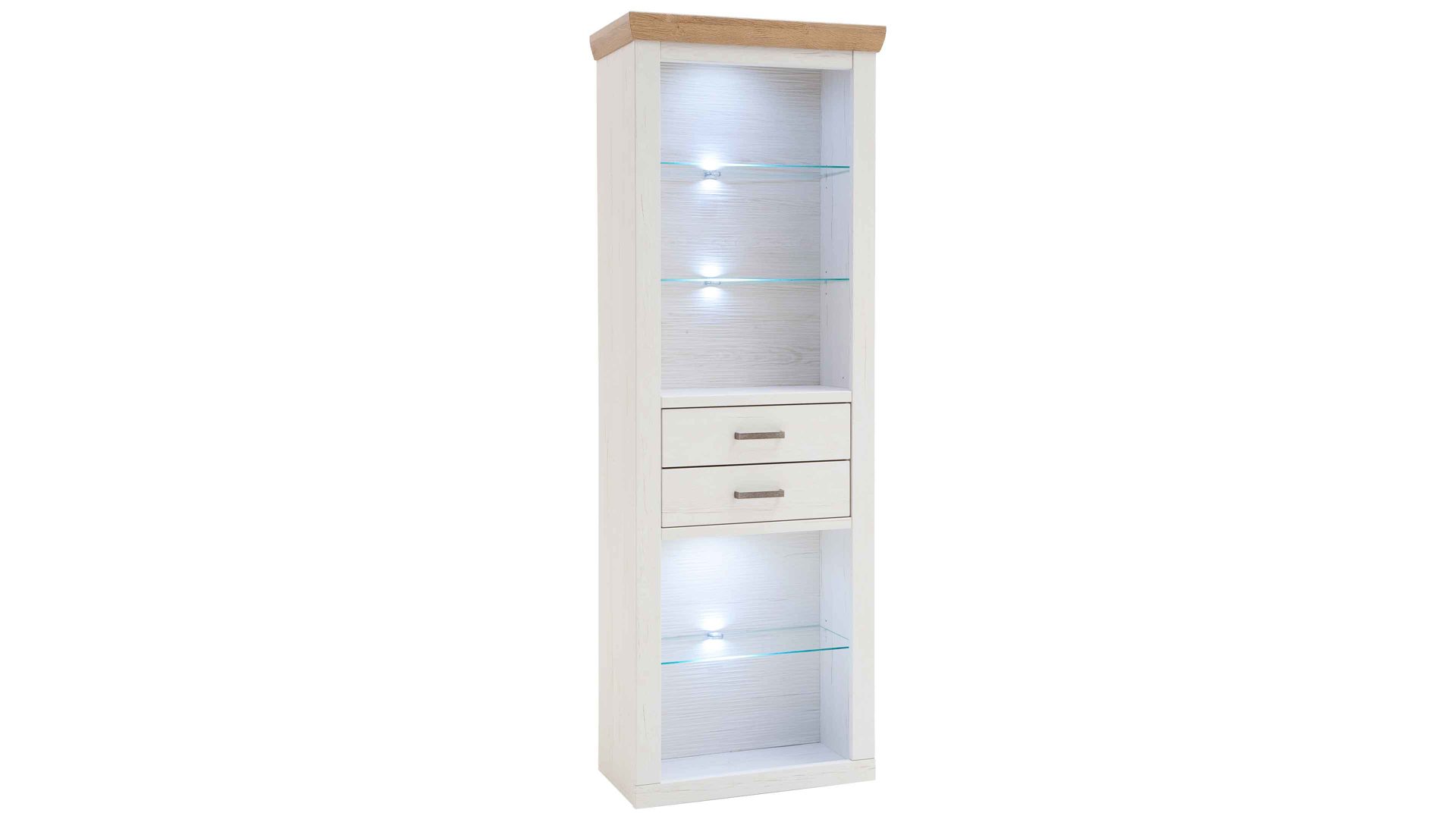 Beim Regal 18 aus dem Wohnprogramm Brixen begeistern sowohl die optischen als auch die funktionalen Merkmale. Es kombiniert Pinie Aurelio-Nachbildung mit Grandson Oak-Nachbildung. Durch die Farben und die spezielle Frontgestaltung erscheint das Wohnmöbel im angesagten skandinavischen Landhausstil. Geschroppte Rückwände, die ebenfalls in Pinie Aurelio-Nachbildung gehalten sind, sorgen für einen weiteren herausragenden Akzent. Klassische Metallgriffe runden das ausdrucksstarke Design stilvoll ab.