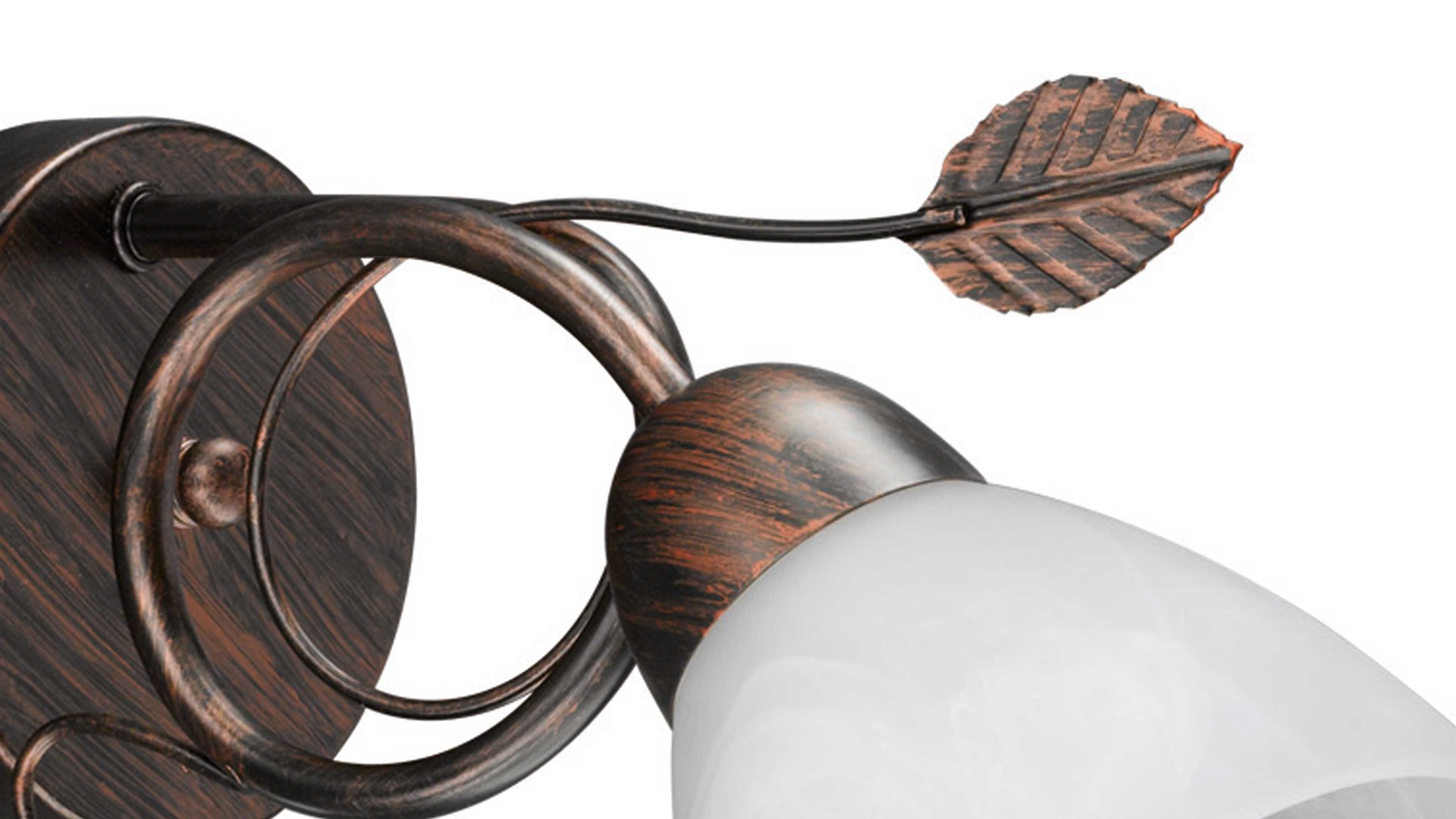 Mit der Kombination aus antik-rostfarbenem Metall und einem edel-alabasterfarbenen Glas-Lampenschirm strahlt die Wandleuchte besondere Eleganz aus.