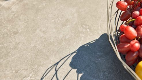 Die betonfarbene Platte aus hochwertigem Sintered Stone ist extrem widerstandsfähig, kratz- und stoßfest, UV- und farbbeständig sowie komplett wetterfest. Ein Outdoortisch, der ganzjährig draußen bleiben kann, ohne an Schönheit zu verlieren.
