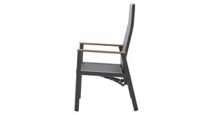 Das anthrazitfarben pulverbeschichtete Aluminiumgestell harmoniert perfekt mit dem Tisch und bleibt dauerhaft pflegeleicht und korrosionsbeständig. Die Teakholz-Armlehnen setzen einen warmen, natürlichen Akzent.