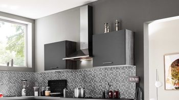 Die Fronten dieser pino Einbauküche sind vorrangig in Grafit designt, kombiniert mit Platingrau. Einen gelungenen Akzent setzen die Korpusseiten und Sockelblenden in Steineiche-Nachbildung. Die Arbeitsplatten präsentieren sich ebenfalls platingrau und steineichefarben. Schlichte Bügelgriffe runden die modern-elegante Optik stilvoll ab.
