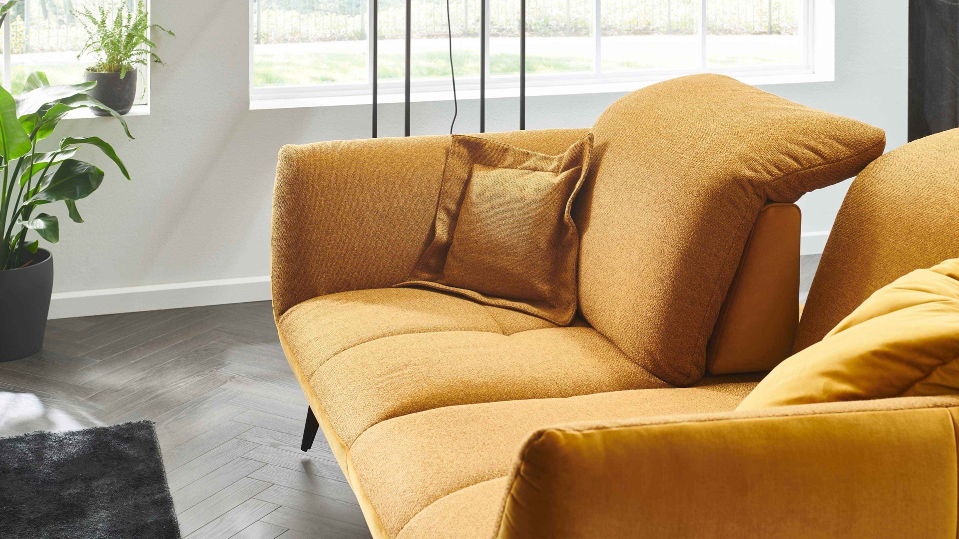 Dieser Dreisitzer aus dem Polsterprogramm New Jersey zeichnet sich durch seine moderne und gemütliche Ausstrahlung, eine exzellente Material- und Verarbeitungsqualität sowie extra hohen Sitzkomfort aus. Der trendige und spezielle senffarbene Stoffbezug sorgt für ein edles Design. Mattschwarze Metallfüße runden die Optik stimmig ab und tragen überdies zur Stabilität des attraktiven Sofas bei. Einen gelungenen Akzent setzt die gesteppte Sitzfläche. Der Rücken der Couch ist glatt bezogen.