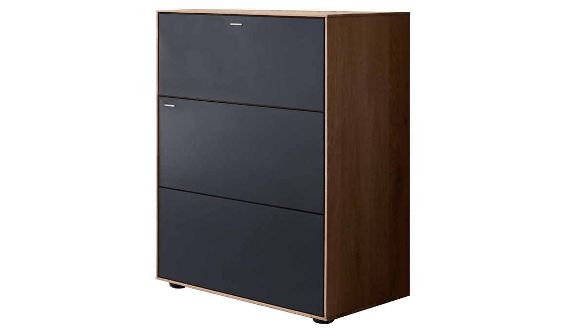 Bei der stark gebürsteten Kerneiche handelt es sich um erstklassiges Massivholz, das mit den Kernrissen und Flügelästen authentische Natürlichkeit in den Flur bringt. Durch die Oberflächenbehandlung mit zwei Schichten sehr matten UV-Wasserlacks und einem finalen Überzug aus Wachs ist das Holz extrem widerstandsfähig und langlebig. Die metallenen Fronten in Anthrazit wirken kontrastierend, fügen sich aber dennoch harmonisch ins Gesamtbild ein. Puristische Metallgriffe runden die Kommodenoptik stimmig ab.
