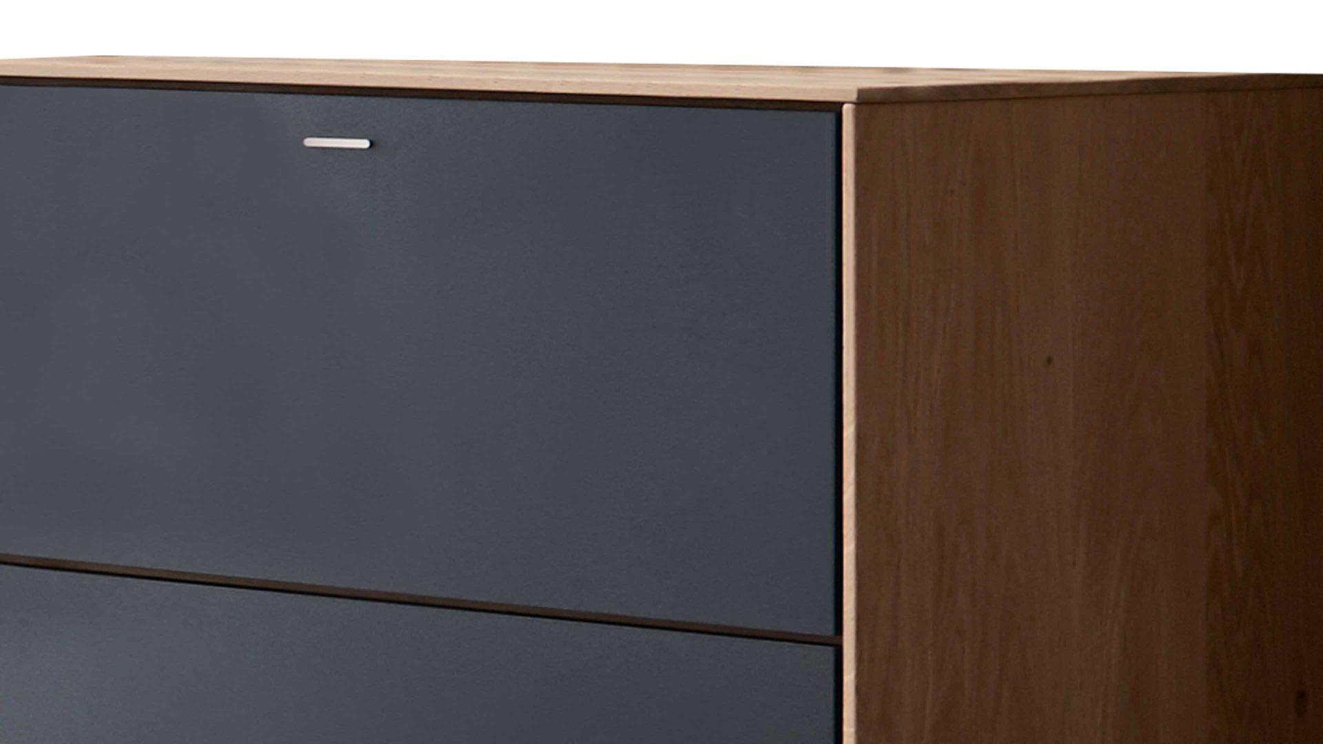 Die Kommode Runa verbindet einen Korpus aus massiver Kerneiche und anthrazitfarben pulverbeschichtete Metallfronten zu einem robusten, modernen und eindrucksvollen Ganzen.