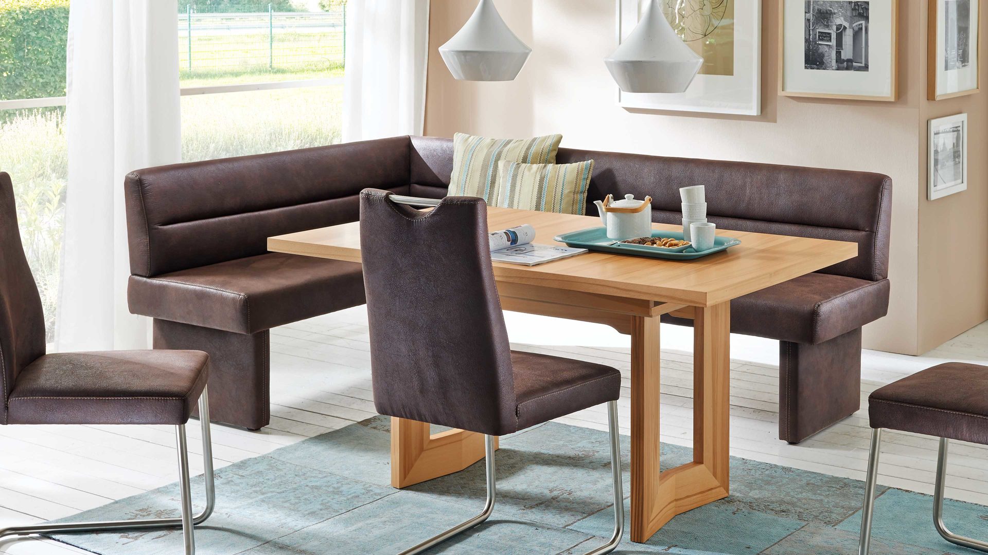 • Die Abbildung zeigt ein Wohnbeispiel, welches auch Dekoration sowie separat erhältliches Zubehör enthält. Im Lieferumfang enthalten ist eine Eckbank Game 2.