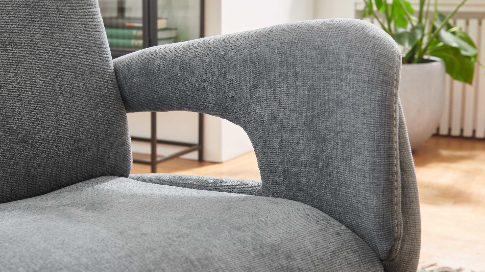 stalfarbener melierter Stoffezug mit Kontrast-Doppelsteppnaht