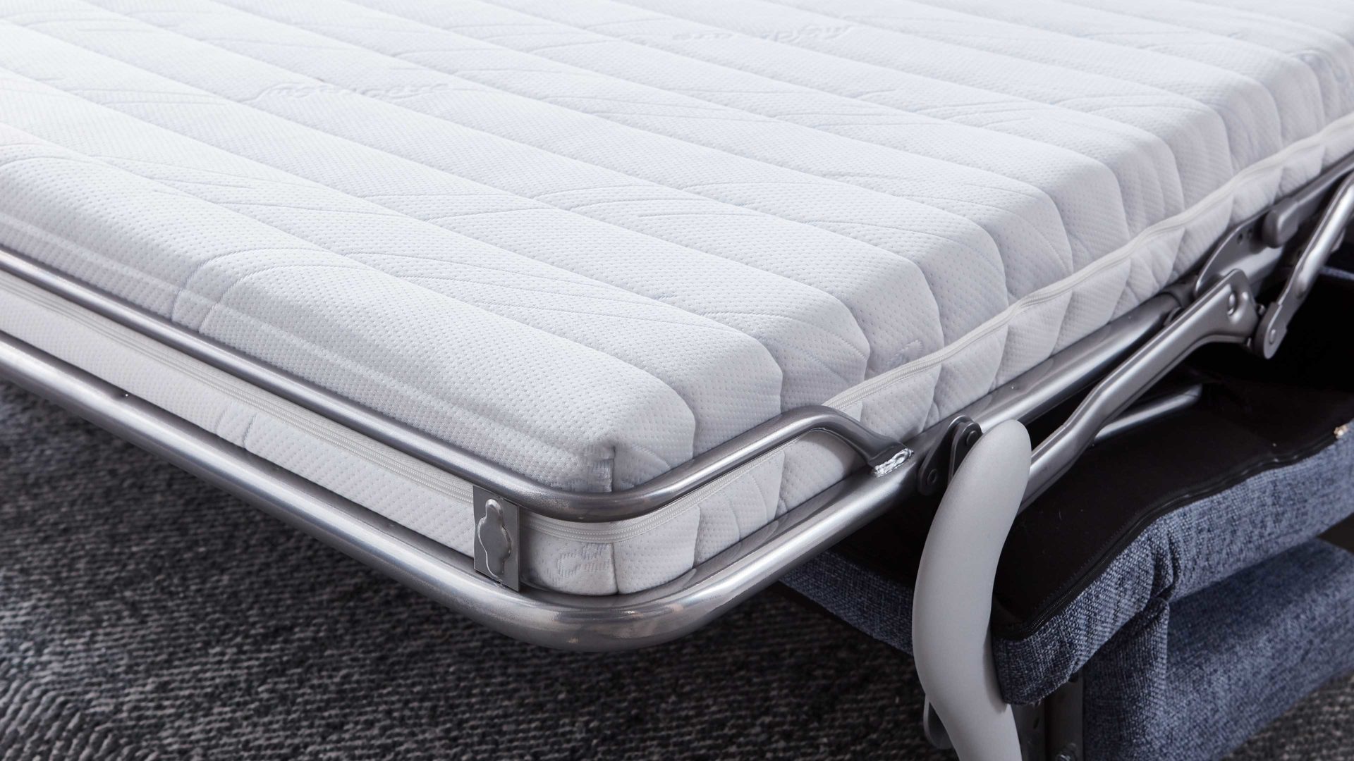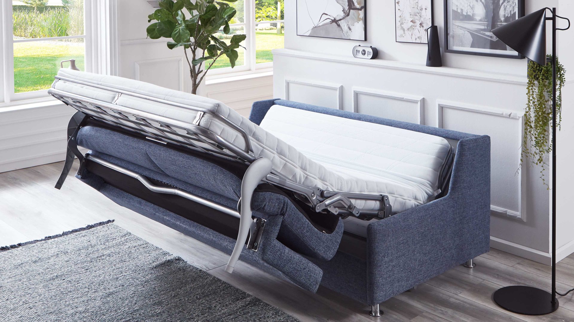 Das Schlafsofa Grande ist die perfekte Lösung für alle, die auf der Suche nach einem stilvollen und funktionalen Möbelstück sind. Mit seinem graublauen Stoffbezug und den chromfarbenen Metallzylinderfüßen ist es nicht nur ein Blickfang in jedem Raum, sondern auch äußerst bequem.