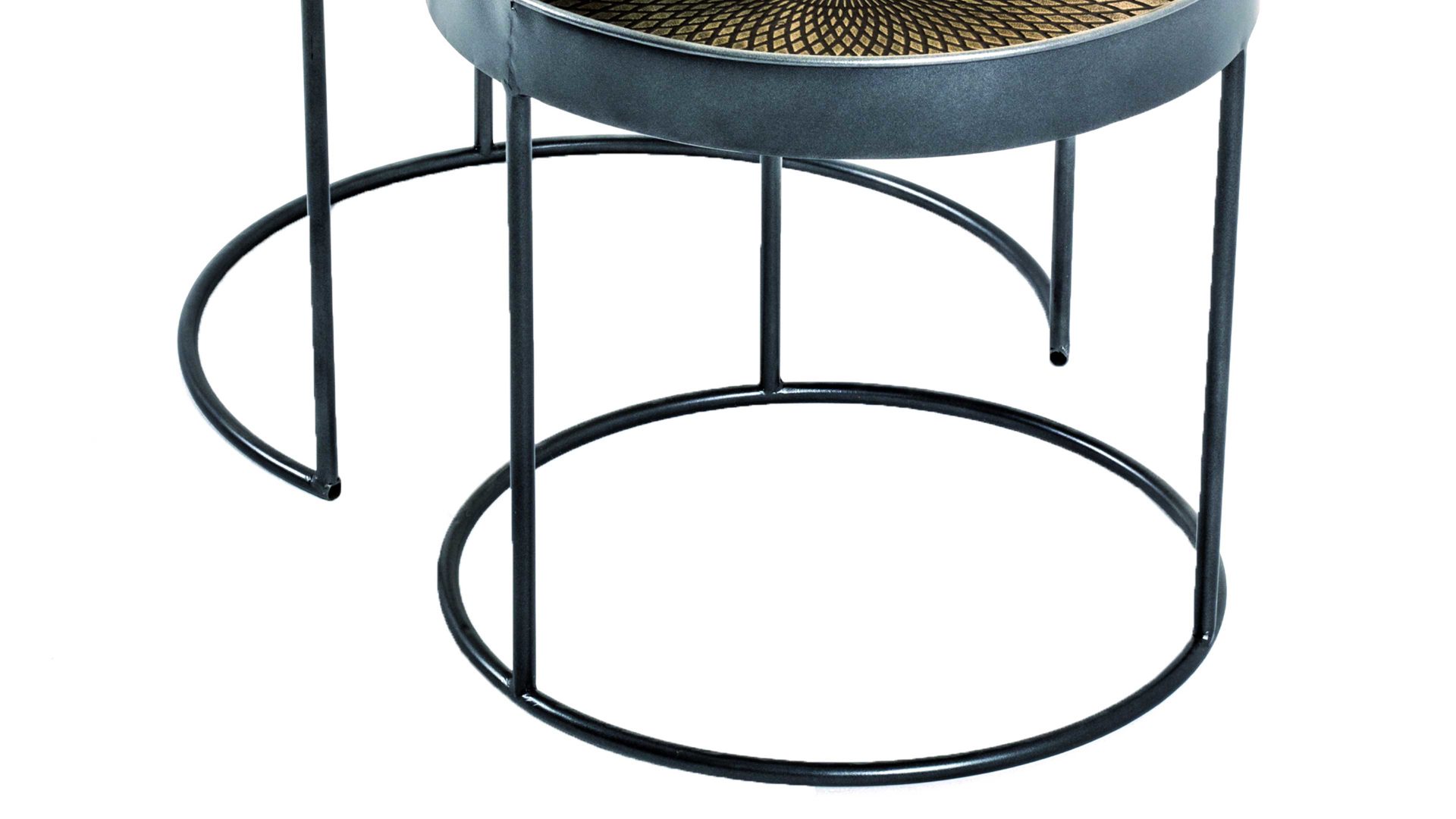 Beide Tischchen verbinden ein puristisch schwarz lackiertes Metallgestell mit einer schwarz-kupferfarben gewischten Metallablage. Sie präsentieren sich modern und elegant - mit dem gewissen Etwas durch das Muster auf den Tischplatten. Dank der hochwertigen Materialien sind die Beistelltische sehr robust, widerstandsfähig und langlebig. Zudem begeistern die pflegeleichten Oberflächen.