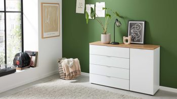 Mit Maßen von ca. 151 x 102 x 46 cm (B/LxHxT) bietet die Superkombikommode großzügigen Stauraum für Kleidung, Wäsche und Accessoires. Die fünf Schubladen sind mit Vollauszug und Softeinzug ausgestattet, was für leises, komfortables Schließen sorgt. Hinter den zwei Türen befinden sich jeweils zwei höhenverstellbare Holzböden, die eine flexible Innenaufteilung ermöglichen – ideal für individuelle Ordnungssysteme.